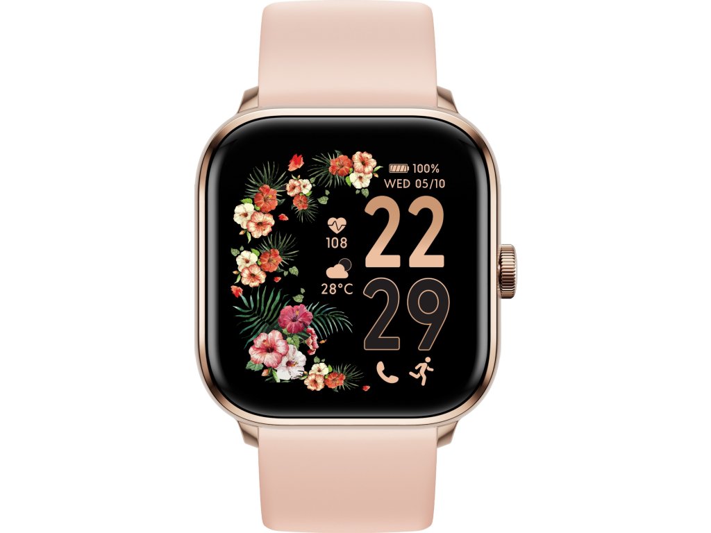 Půvabné provedení s nude světle růžovým silikonovým řemínkem zajišťuje pohodlí při nošení a perfektní přizpůsobení zápěstí. Hranaté hliníkové pouzdro doplňuje 1,7" AMOLED displej (336 × 336 px) s úhlopříčkou 43 mm, který nabízí výbornou čitelnost i na přímém slunci.