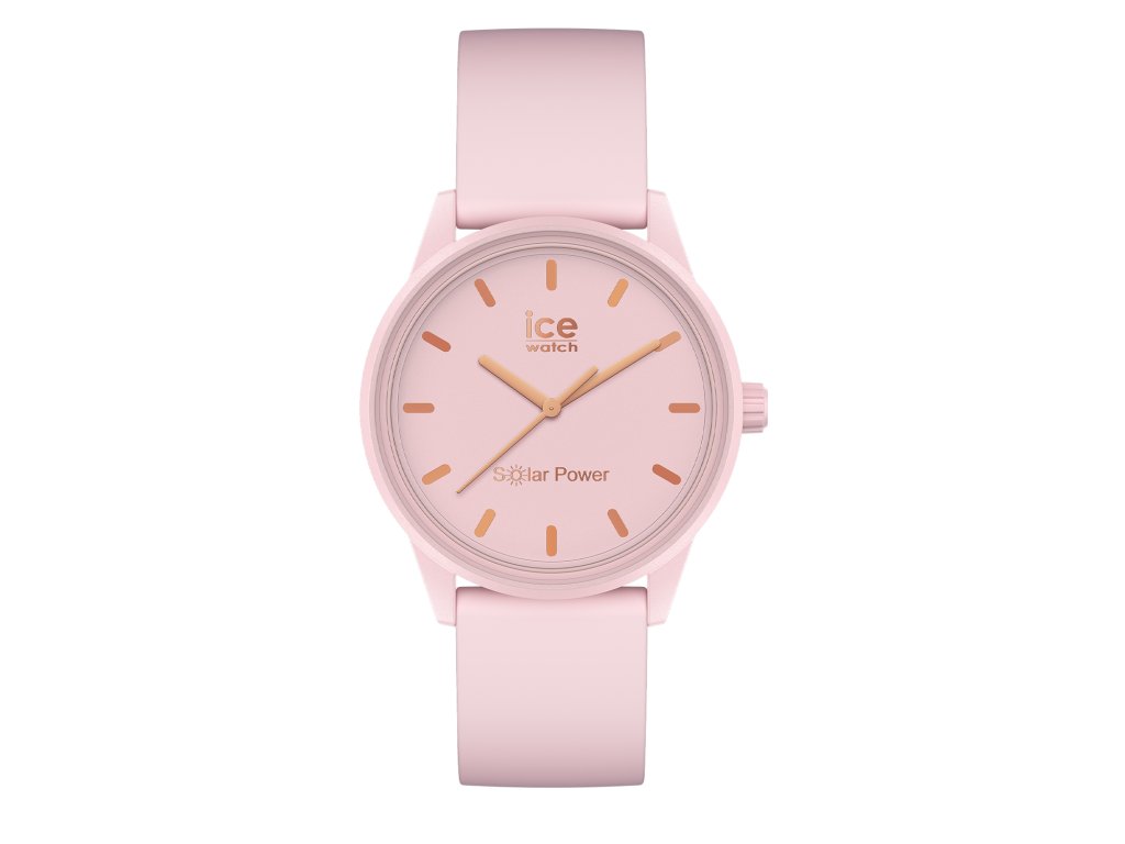 Dámské náramkové hodinky poháněné solární energií se silikonovým řemínkem růžové barvy a číselníkem, indexy a ručičkami v barvě růžového zlata.