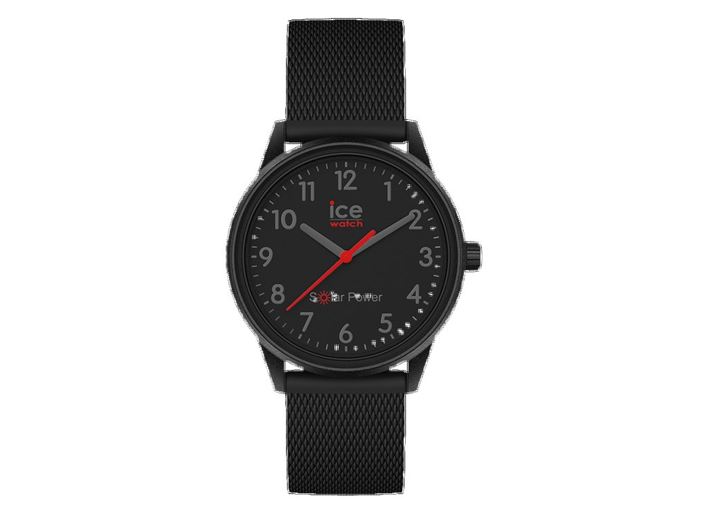 Dámské náramkové hodinky poháněné solární energií s černým řemínkem a číselníkem s šedými číslicemi a ručičkami.
