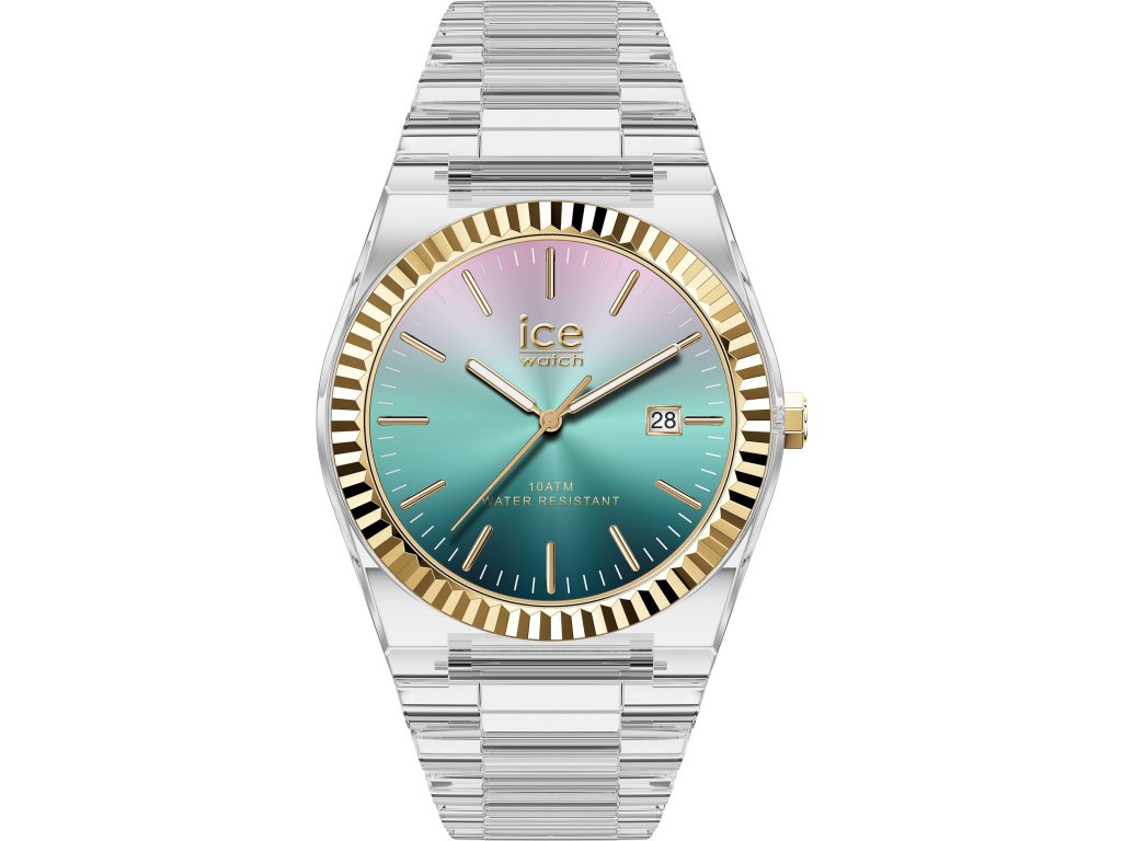 Záře západu slunce na průzračném pozadí. Dámské hodinky ICE POWER Clear Sunset Verdigris okouzlí jemnými tóny zelené, růžové a zlaté, které se na číselníku prolínají jako poslední paprsky slunce nad klidným mořem.