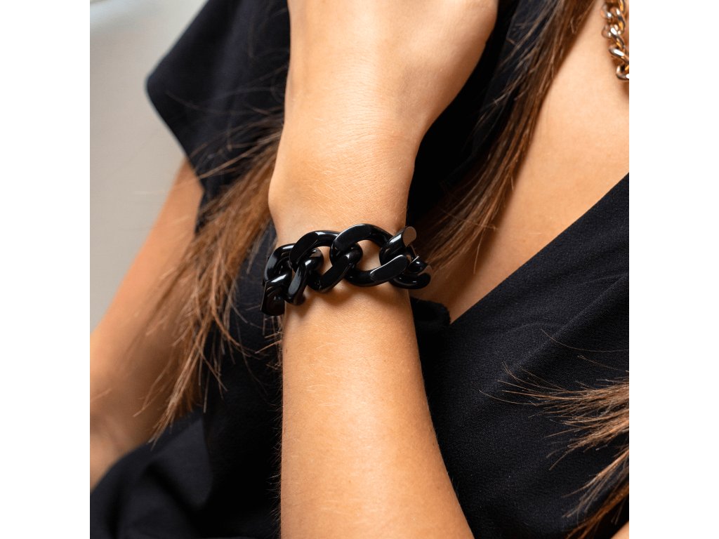 Černý stylový náramek vzhledu velkého řetězu se zapínáním na karabinu ve zlaté barvě.Doplňkové parametry