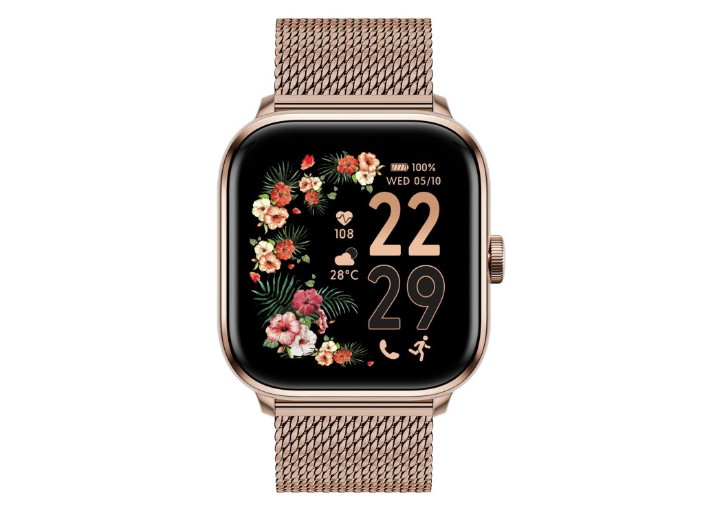 Hodinky vynikají hranatým pouzdrem z hliníku a ocelovým řemínkem v růžovo-zlatavé barvě, který jim dodává sofistikovaný vzhled. 1,7” AMOLED displej s rozlišením 336 × 336 px a úhlopříčkou 43 mm zaručuje skvělou čitelnost a jasné barvy.
