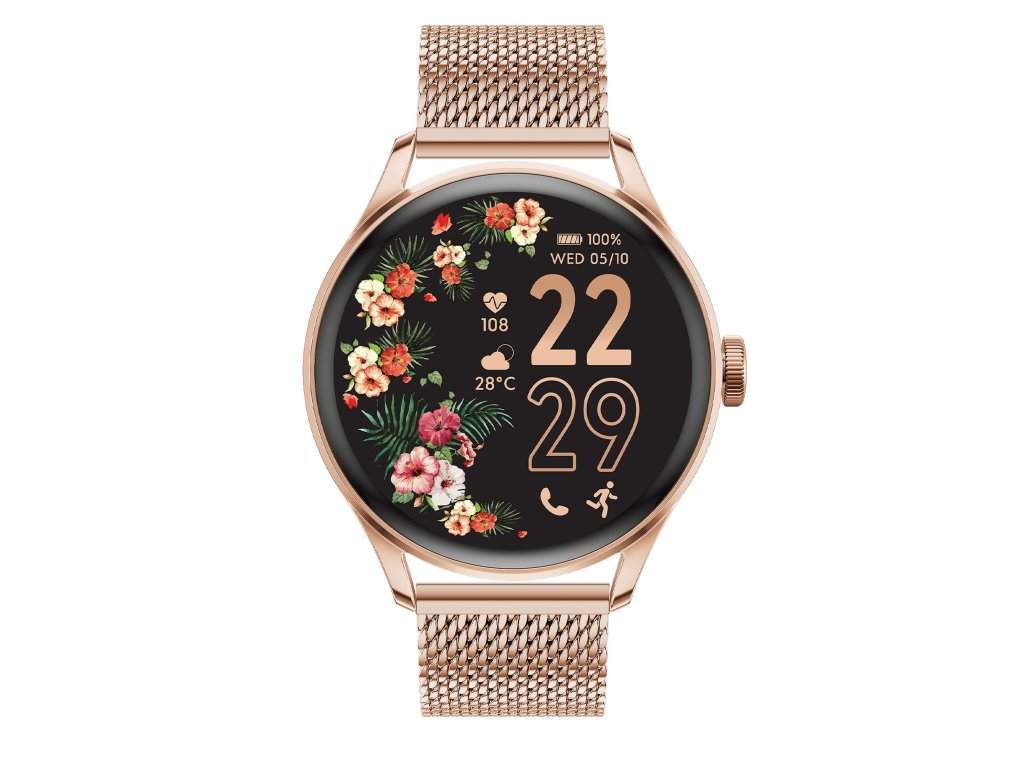 Hodinky zaujmou kulatým pouzdrem z hliníku a ocelovým tahem v růžovo-zlatavé barvě, který jim dodává sofistikovaný vzhled. 1,2” AMOLED displej s rozlišením 390 × 390 px a úhlopříčkou 30 mm nabízí ostrý a detailní obraz s jemnými barvami.