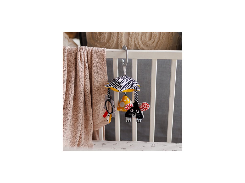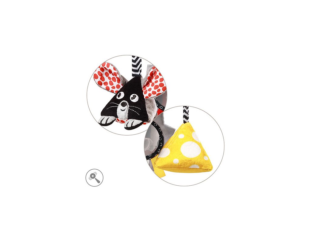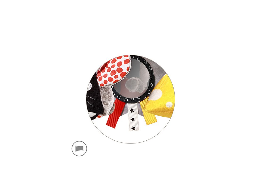 Kontrastní kolotoč MOUSE – senzorická závěsná hračka pro miminka Kontrastní kolotoč MOUSE je hravá senzorická závěsná hračka plná překvapení, která podporuje přirozený vývoj miminka již od narození. Veselá myška probouzí dětskou fantazii, stimuluje smysly a podporuje rozvoj jemné motoriky. Kolotoč je vybaven dvěma chrastítky a šusticími prvky, které rozvíjejí sluch, barevnými štítky a zatočeným ocáskem, jež motivují k uchopování, a také bezpečným zrcátkem pro objevování vlastního odrazu. Hračka je navržena v kontrastních barvách s geometrickými vzory, které podporují vývoj zraku už od prvních měsíců života. Závěsku snadno připevníte na kočárek nebo autosedačku a zajistíte tak zábavnou a rozvojovou hru doma, na procházkách i na cestách. Chrastítka v myšce a sýru Kolotoč obsahuje dvě chrastítka s odlišnou intenzitou zvuku. Jedno vydává jemnější tón, druhé výraznější. Podporují sluchové vnímání a motivují dítě k pohybu, třepání a objevování. Šusticí ouška Dotykem oušek vzniká jemný šustivý zvuk, který podporuje zvídavost a rozvoj smyslového vnímání prostřednictvím dotyku a mačkání. Praktické zavěšení Díky univerzálnímu úchytu lze hračku snadno zavěsit na kočárek, postýlku nebo autosedačku. Závěsku jednoduše připnete i sundáte podle potřeby. Barevné štítky a hravé detaily Vystupující stužky v kontrastních barvách a geometrických vzorech upoutají pozornost a vybízejí k dotyku. Dítě si při hře přirozeně procvičuje úchop a obratnost prstíků. Zrcátko Zrcátko je vyrobeno z bezpečného materiálu. Pozorování vlastního odrazu podporuje rozvoj sebeuvědomění a koordinaci ruka–oko. Podpora zdravého vývoje Kolotoč je navržen tak, aby se dobře držel v malých ručičkách. Podporuje rozvoj jemné motoriky, koordinace ruka–oko, smyslového vnímání a dětské fantazie. Technické informace Materiál: polyester. Rozměr: cca 27 × 16 cm. Obsahuje: dvě chrastítka, šusticí ouška, zatočený ocásek, barevné štítky, bezpečné zrcátko a praktický úchyt k zavěšení. Vhodné pro děti Od narození (0 m+). Bezpečnostní upozornění Hračku připevňujte mimo dosah dítěte. Při pokusech dítěte o lezení nebo zvedání se hračku odstraňte. Odstraňte veškeré obalové a upevňovací prvky, které mohou být nebezpečné. Před každým použitím zkontrolujte stav výrobku. Používejte pouze nepoškozenou hračku. Při prvních známkách poškození výrobek přestaňte používat. Používejte vždy pod dohledem dospělé osoby. Výrobek splňuje normu EN 71. Obal uchovejte pro případné informace a skladujte mimo dosah dětí.Doplňkové parametry