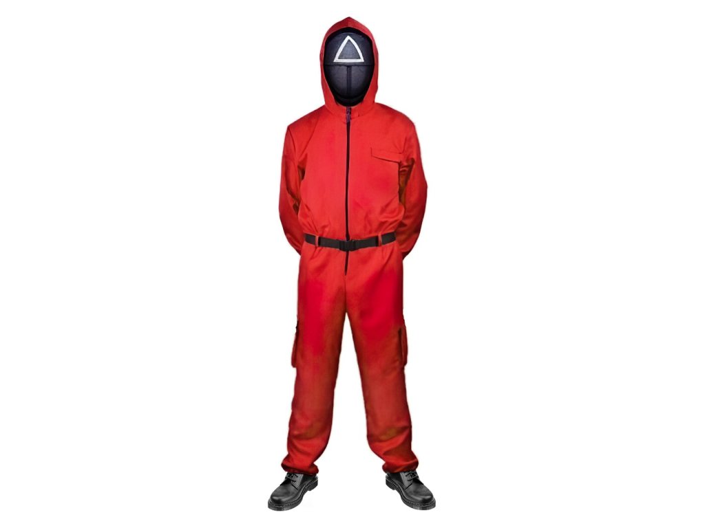 Tento kostým je věrnou replikou uniformy, kterou nosí strážci dohlížející na průběh her. Červený overal s kapucí a černá maska s geometrickým symbolem jsou charakteristickými prvky, které okamžitě každý fanoušek rozpozná. Připravte se na to, že v tomto outfitu budete působit nejen záhadně, ale také nebezpečně autoritativně.