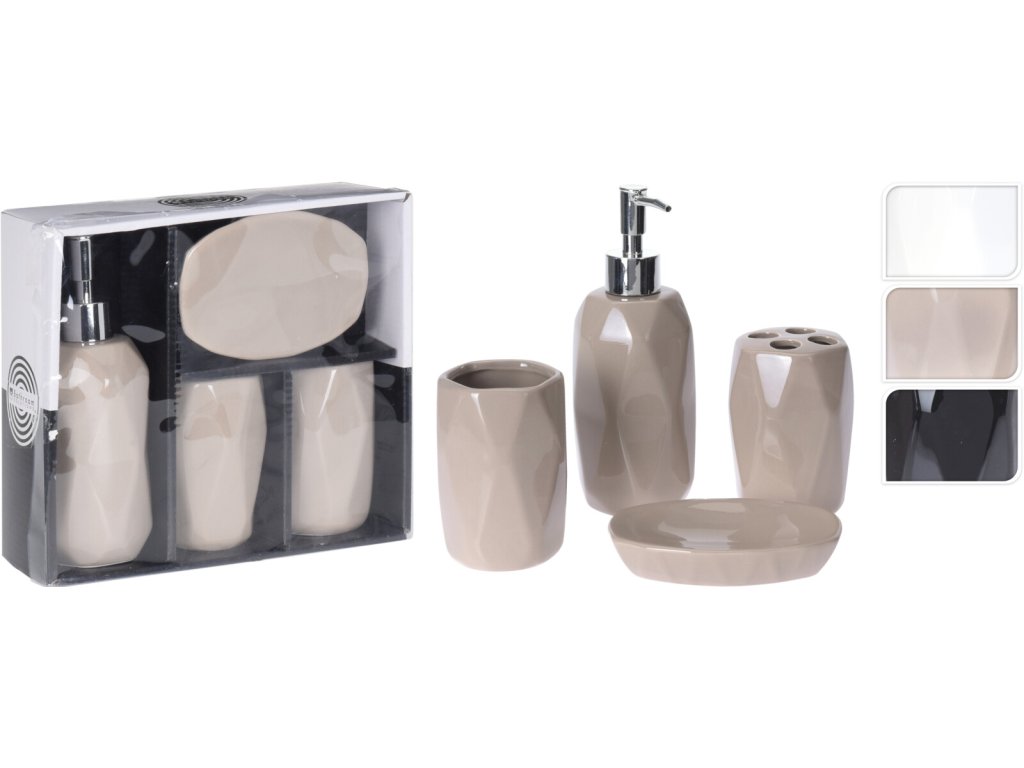 - dóza 7 x 7 x 10,8 cm; držák kartáčků 7 x 7 x 10,5 cm; mýdlenka 13 x 9 x 2,5 cm; dávkovač tekutého mýdla 7,5 x 7,5 x 19,5 cm