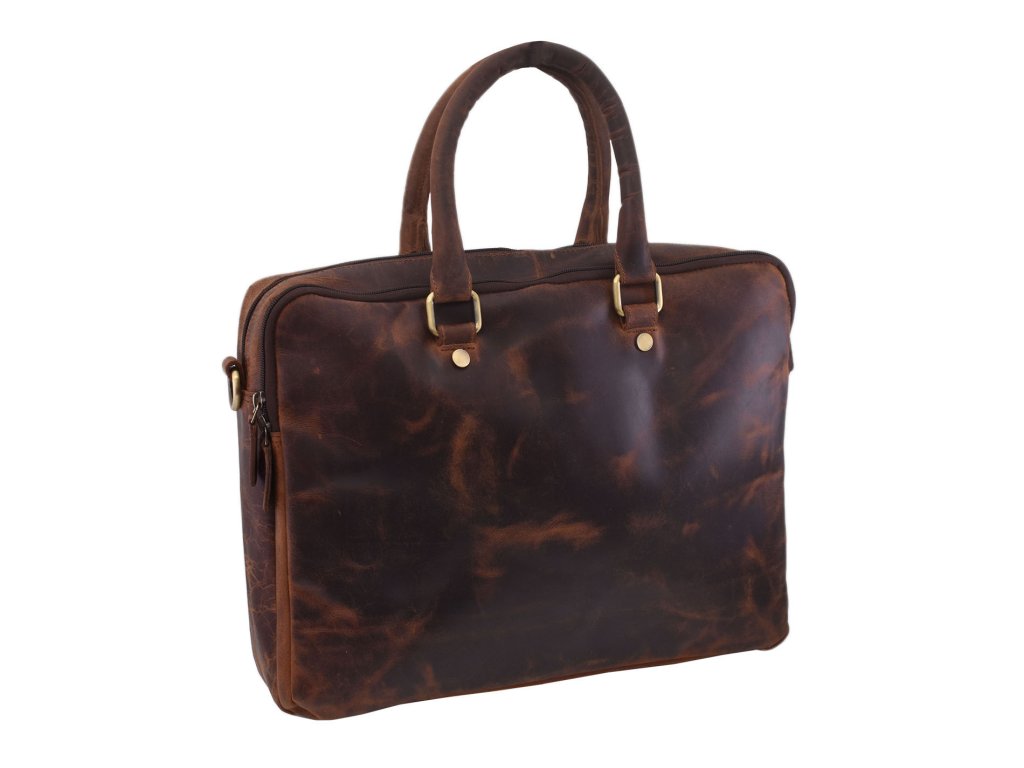 Pánská kožená taška na notebook v elegantním provedení nemusí být pouze pánská, jelikož ji mají rádi i dámy. Taška má odnímatelný kožený popruh, díky kterému ji můžete nosit přehozenou přes rameno, ale zároveň lze tašku nosit i v rukou. Brašna nabízí dostatečně mnoho prostoru pro přehledné uspořádání A4 dokumentů nebo notebooku s uhlopříčkou 14“. Samozřejmě, taška je přizpůsobena k nošení notebooku, takže obsahuje vypolstrovanou přihrádku. Taška je šitá z kvalitní hovězí HUNTER kůže s drsným povrchem. Tato kůže je charakteristická tím, že časem o stupeň ztmavne.
