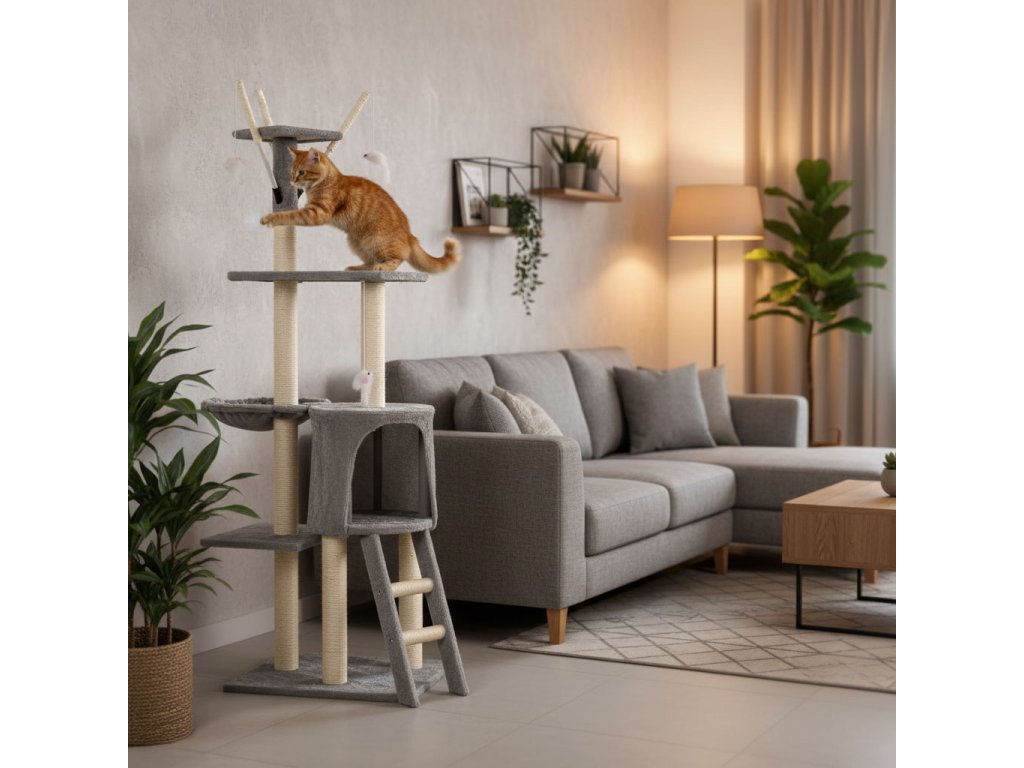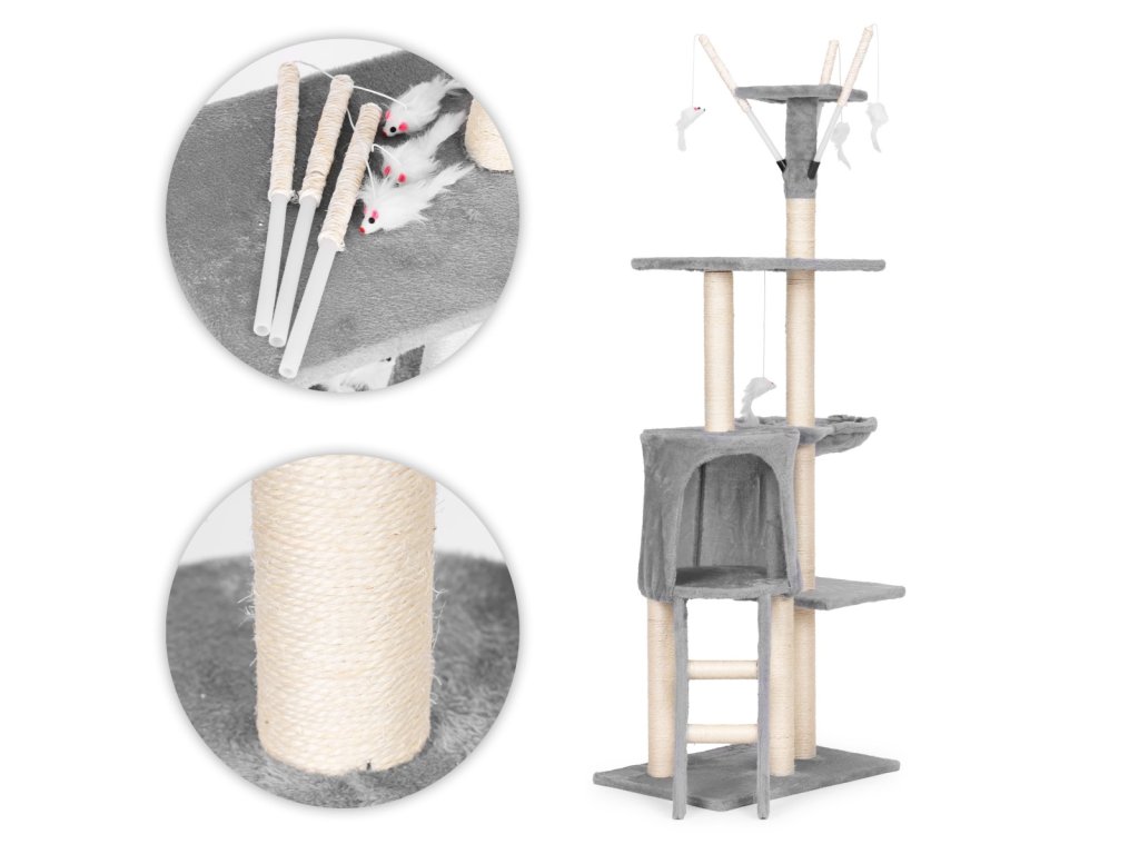 Škrabadlo pro kočku 134 cm s domečkem a hamakem Petsi – šedé. Vysoké a stabilní škrabadlo pro kočky 134 cm nabízí ideální kombinaci prostoru pro škrábání, šplhání, odpočinek i hru. Moderní šedé provedení se hodí do každého interiéru a vytvoří vaší kočce vlastní bezpečnou zónu. Konstrukce s pěti úrovněmi umožňuje kočce přirozený pohyb do výšky. Prostorný domeček s měkkým pelíškem poskytuje klidné místo pro spánek. Otulující hamak je ideální pro pohodlný odpočinek. Tři vyhlídkové platformy umožňují sledování okolí z výšky. Funkce podporující aktivitu kočky. Závěsné myšky stimulují hravost a lze je vyjmout pro samostatnou hru mimo škrabadlo. Sisalové sloupky umožňují přirozené broušení drápků a pomáhají chránit nábytek. Konstrukce podporuje fyzickou aktivitu a pomáhá předcházet nudě. Technické informace. Rozměry: 50 × 35 × 134 cm. Hmotnost: 8 kg. Materiál: MDF deska, sisal, len, flanel. Barva: šedá. Upozornění: Tento výrobek není hračka pro děti. Určeno výhradně pro domácí zvířata. Používejte pouze dle pokynů výrobce. Před použitím zkontrolujte správné sestavení a stabilitu výrobku. Obal není hračka, odstraňte jej z dosahu dětí.Doplňkové parametry