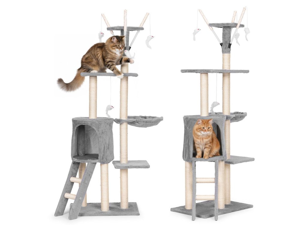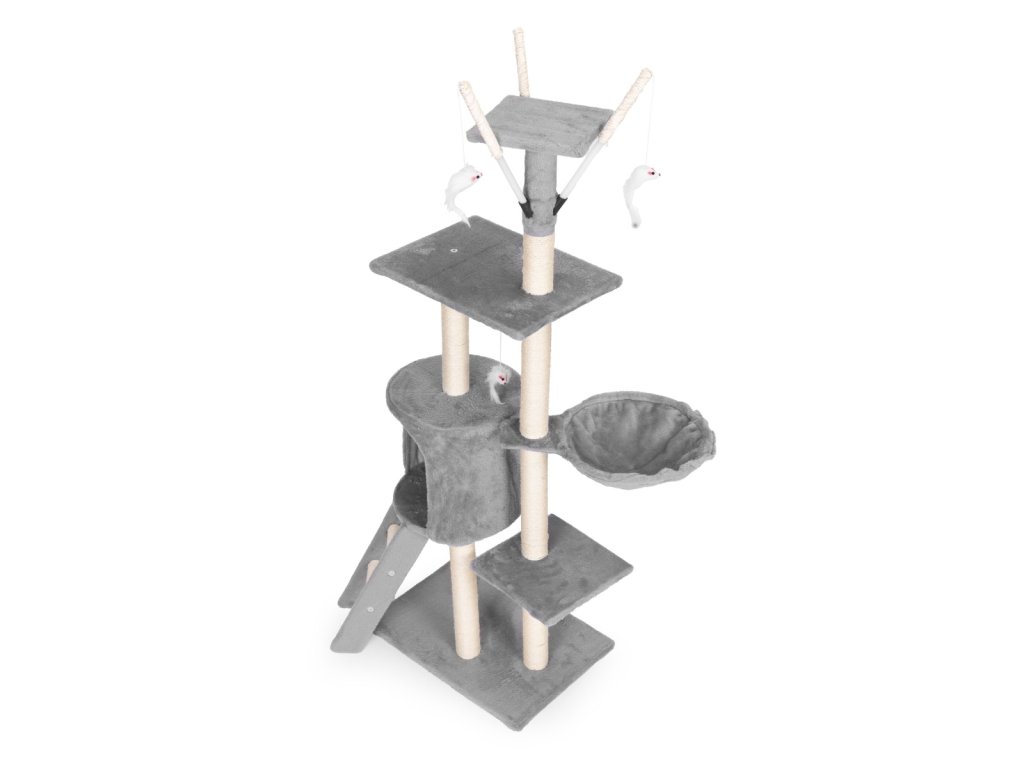 krabadlo pro kočku 134 cm s domečkem a hamakem – šedé