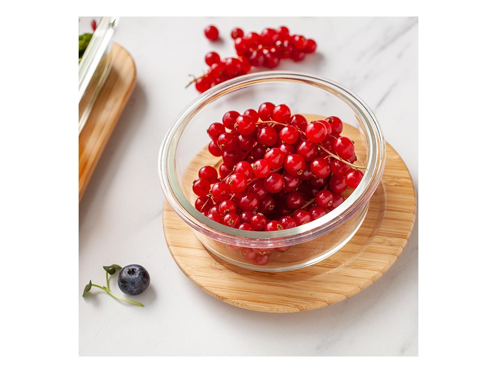 Bambusové víčko je vyrobeno z přírodního materiálu, který je odolný a snadno se udržuje. Bambusové dřevo je přirozeně antibakteriální, takže pomáhá udržet potraviny čerstvé. Těsnění je vyrobeno ze silikonu a zabraňuje vniknutí vzduchu a vlhkosti do dózy. Sklo je žáruvzdorné, nepřenáší pachy a je odolné proti poškrábání. Výška dózy 5,9 cm, průměr dózy 13,4 cm. Skleněná dóza (bez víčka) je vhodná do mikrovlnné i klasické trouby, mrazáku, je možné mýt ji v myčce.