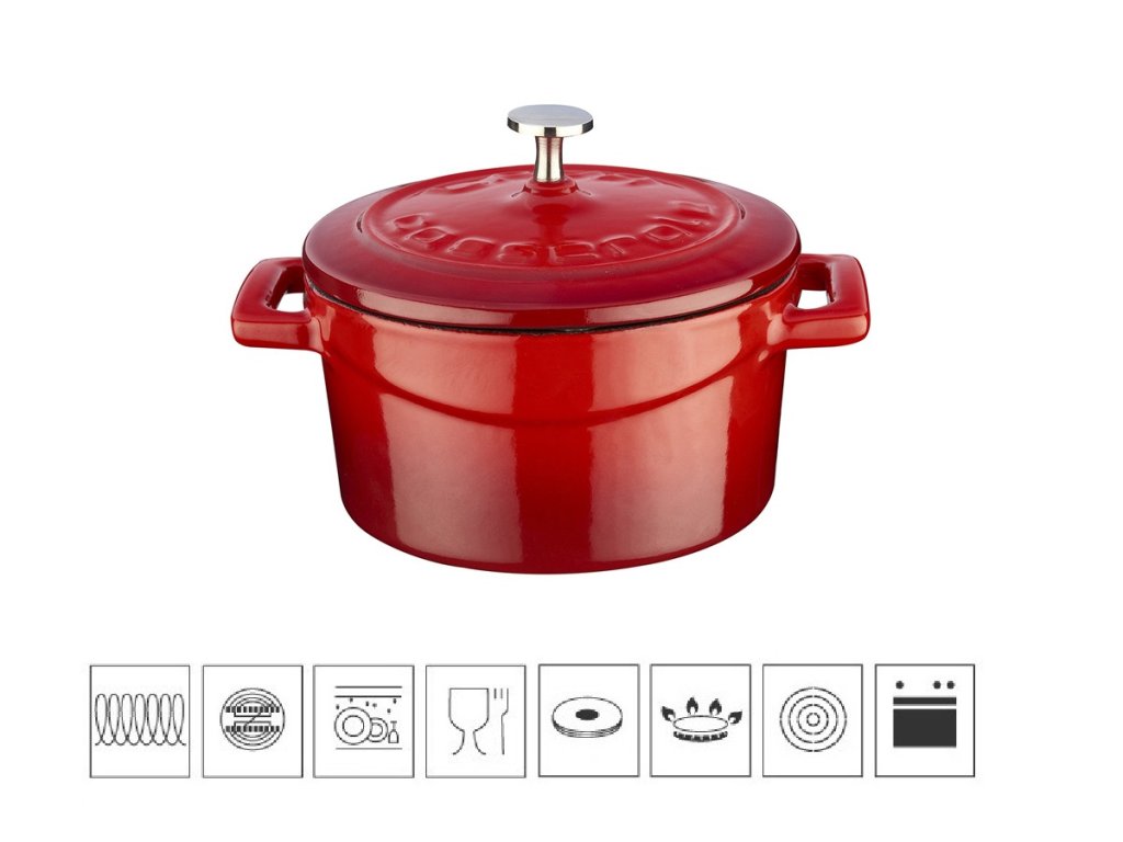 Krásný červený hrnec ze smaltované litiny v mini provedení, typ kokotka (z francouzského cocotte, kastrůlek). Průměr hrnce 10 cm, objem 0,35 l, pro 1 porci pokrmu, je ideální také pro stylové servírování přímo na prostřeném stole. Hrnec se tak stane ozdobou Vaší kuchyně. Litina samotná nabízí velmi vysokou tepelnou vodivost, což v kombinaci se značnou silou materiálu zaručuje vysokou efektivitu při vaření. Vhodný pro všechny druhy sporáků, včetně indukce. Mytí v myčce se nedoporučuje z důvodu utlumení jasu barev. Poznávacím znamením hrnců série "Folk" je rovná poklice.