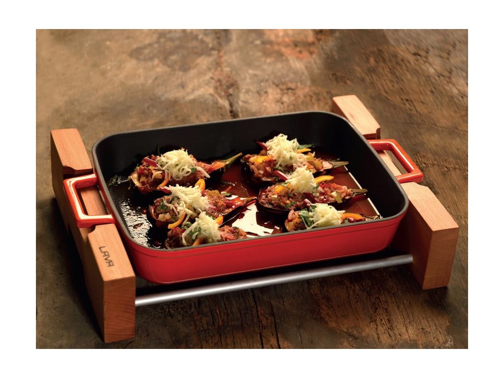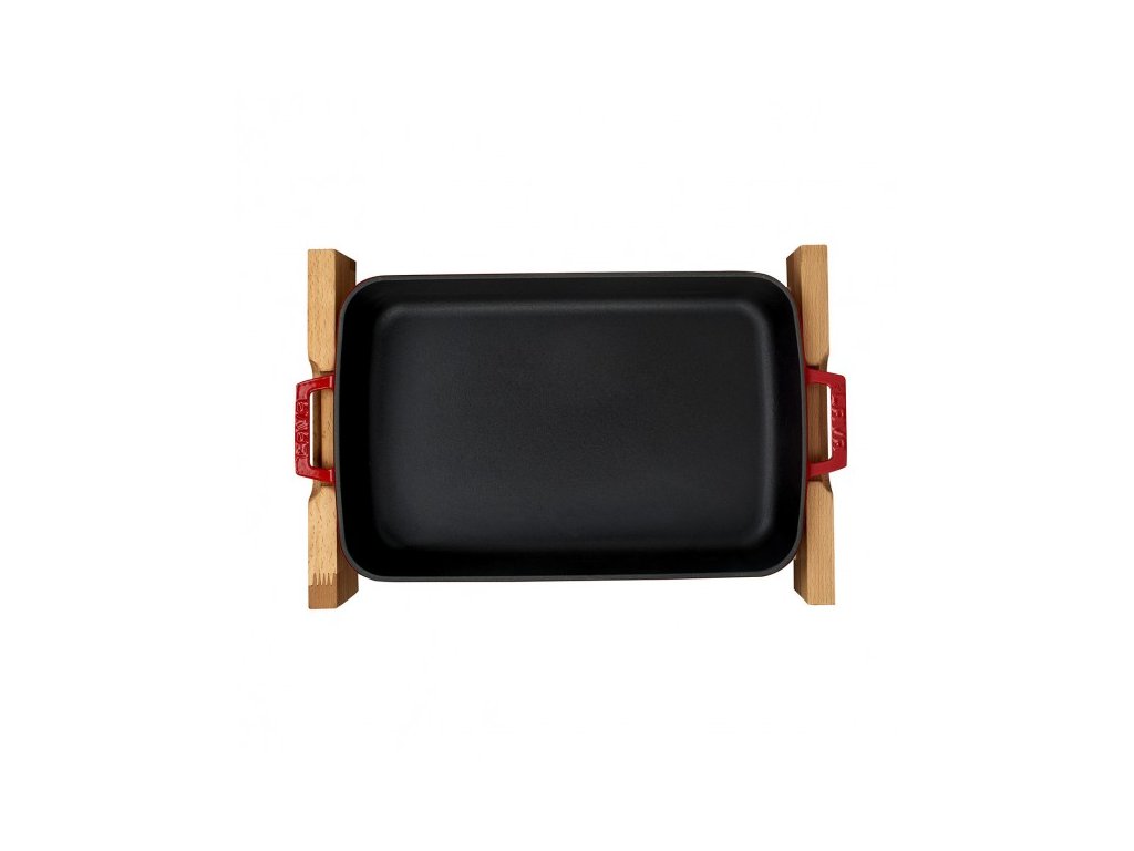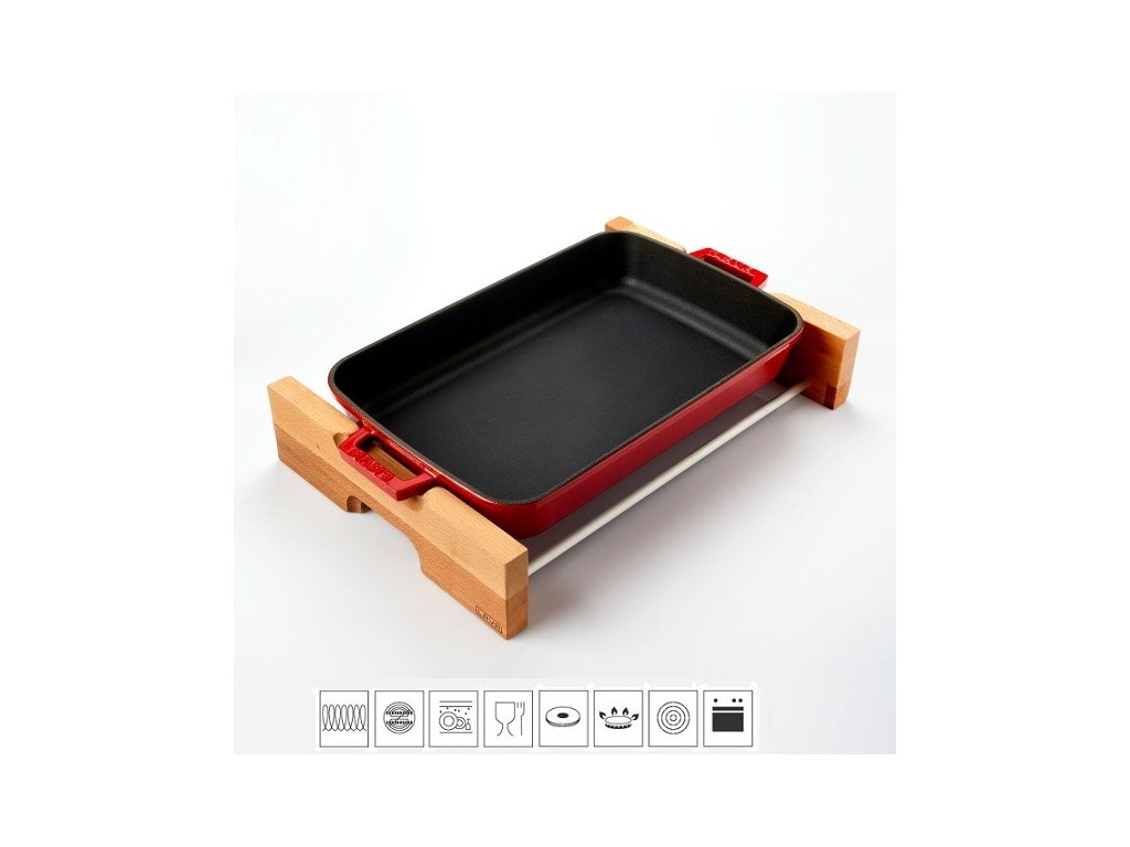 Litinový pekáč 22x30cm s dřevěným podstavcem - červený