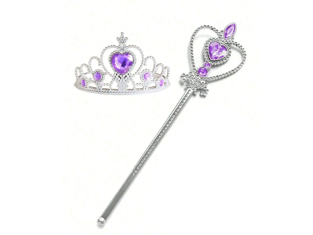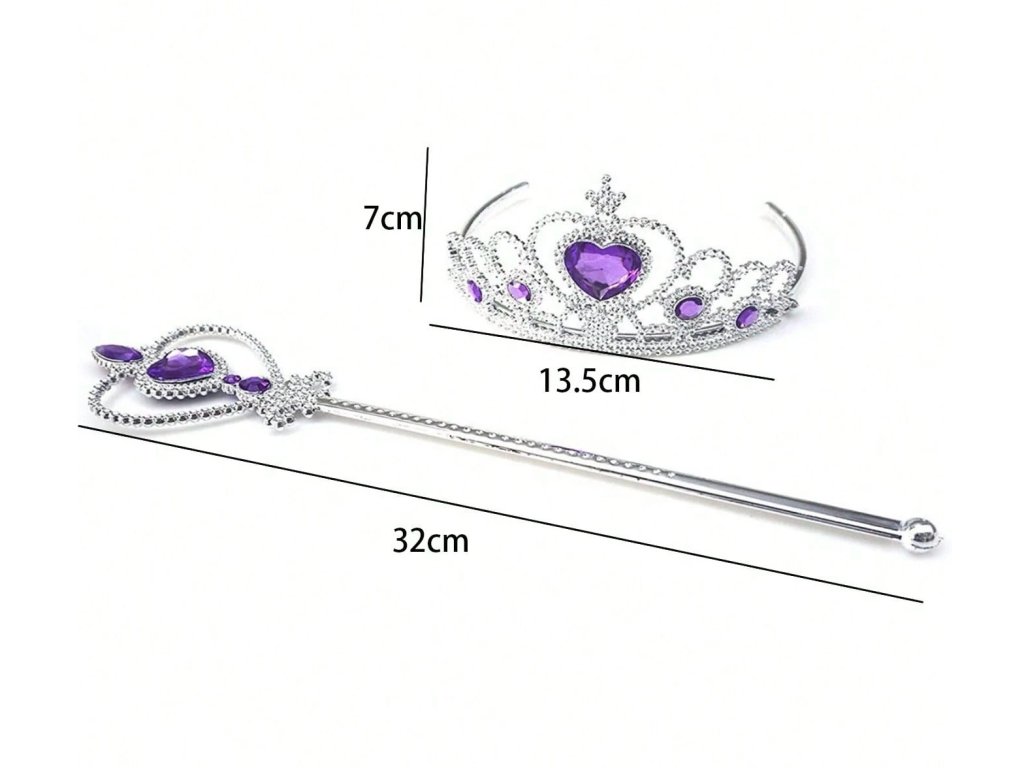 Elegantní korunka a ladící žezlo jsou zdobeny fialovými kamínky ve tvaru srdce, které dodávají celému vzhledu jemný královský nádech. Korunka je lehká a pohodlná na nošení, vyrobená z plastového materiálu s jemnými detaily, které připomínají kouzelnou atmosféru království. Díky pružnému provedení dobře drží na hlavě a je ideální pro dětské hraní i slavnostní chvíle.