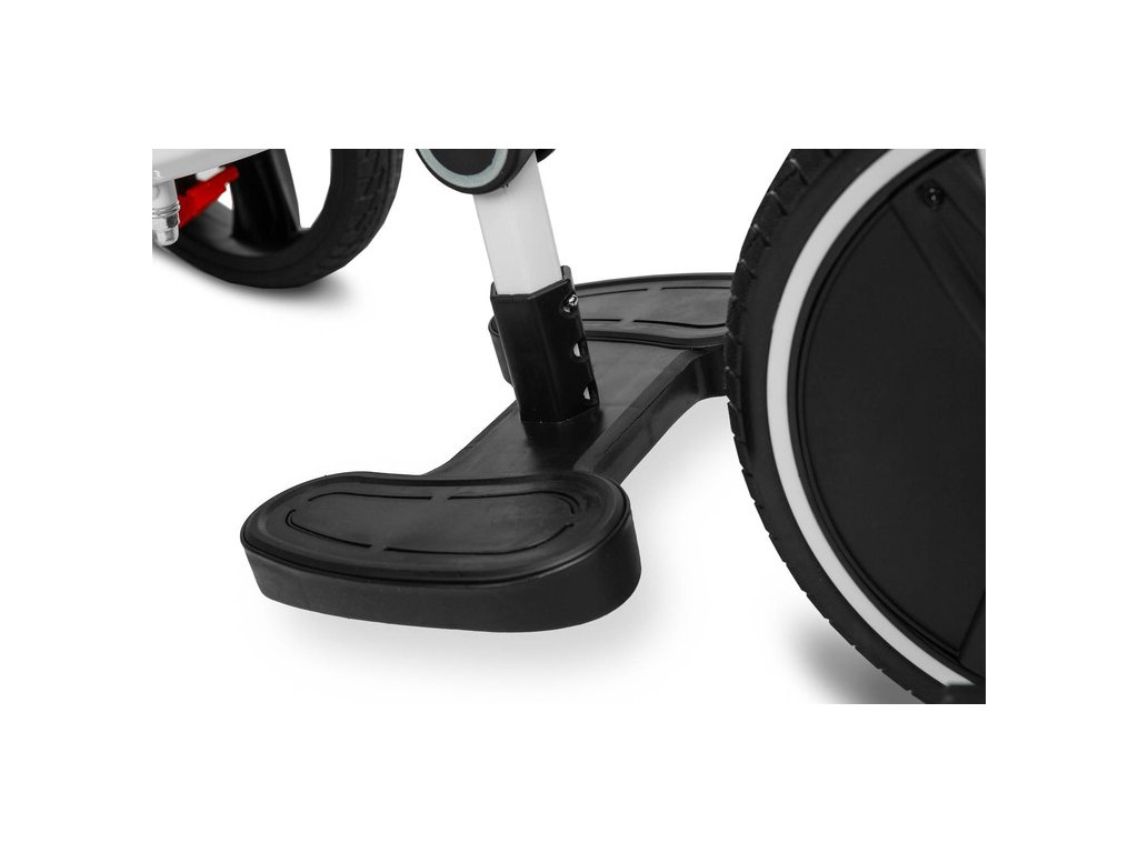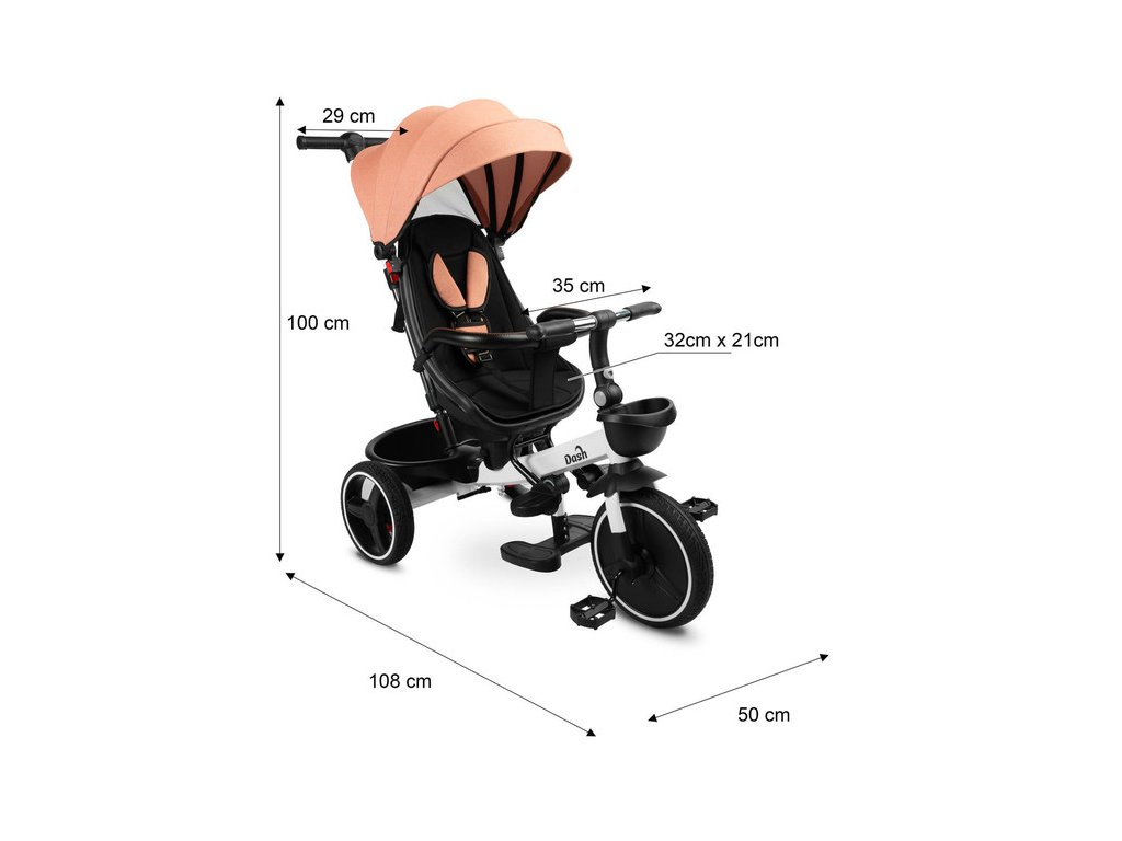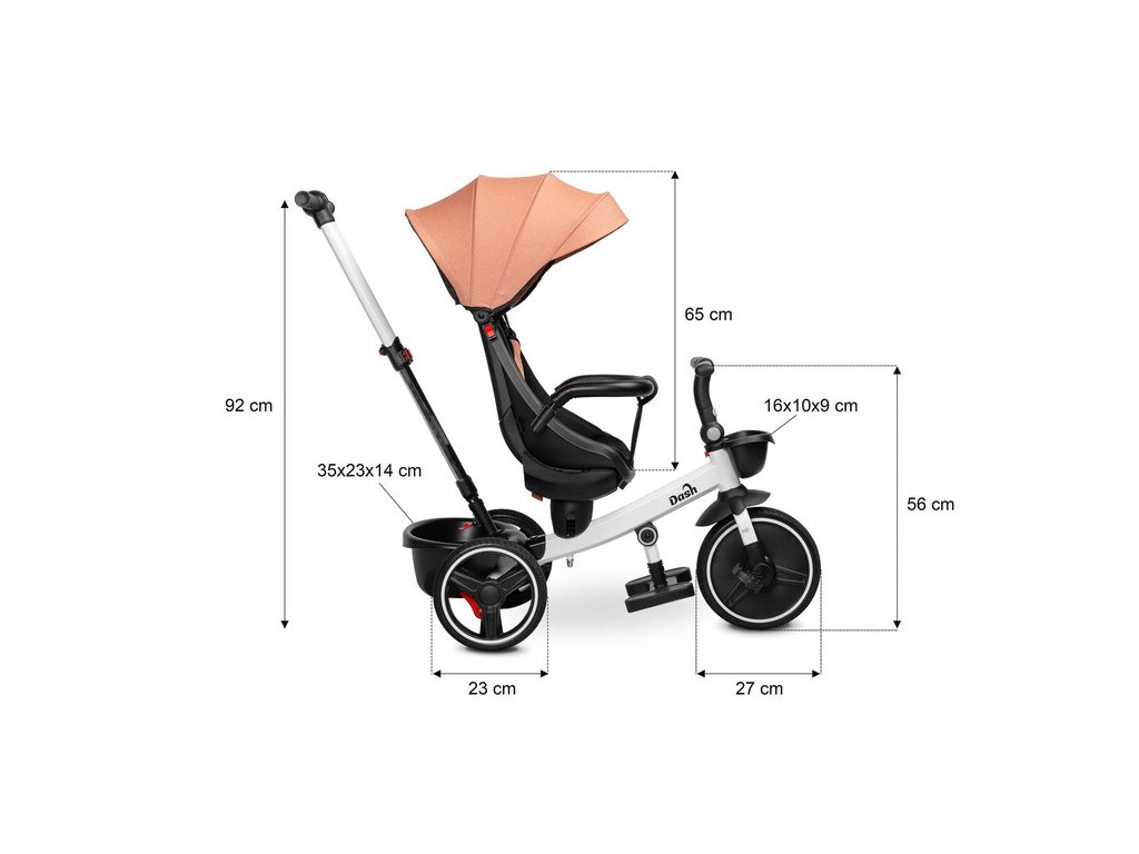 Tříkolka Dash je skvělou alternativou k sportovnímu kočárku. Lze ji použít jako kolo, na kterém může dítě jezdit samostatně, nebo jako kočárek s ochrannou stříškou, ve kterém může dítě sedět čelem či zády ke směru jízdy. Přední a zadní košíky umožňují přepravu drobností. Tříkolka je vybavena dvěma opěrkami nohou: jedna je součástí rámu a druhá je připevněna k sedadlu, obě jsou nastavitelné pro pohodlí dítěte. Zadní kola mají brzdy, které zajišťují, že tříkolka zůstane bezpečně na místě. Klíčové vlastnosti: - stříška chránící před deštěm a sluncem, - odnímatelná zábrana pro snadné nastupování, - tříbodové bezpečnostní pásy, - otočné sedadlo s nastavitelným opěradlem, - snadno čistitelný polyesterový potah, - dvě nezávislé brzdy, - řídící rukojeť s nastavitelnou výškou, - dva košíky na drobnosti. Technické údaje: - věkový rozsah: 3 – 5 let, - rozměry: 108 x 50 x 100 cm, - hmotnost: cca 9,8 kg, - max. hmotnostní limit: 25 kg, - průměr kol: přední kolo 27 cm, zadní kola 23 cm. Rozměry balení: 61,5 x 33 x 38 cm.Doplňkové parametry