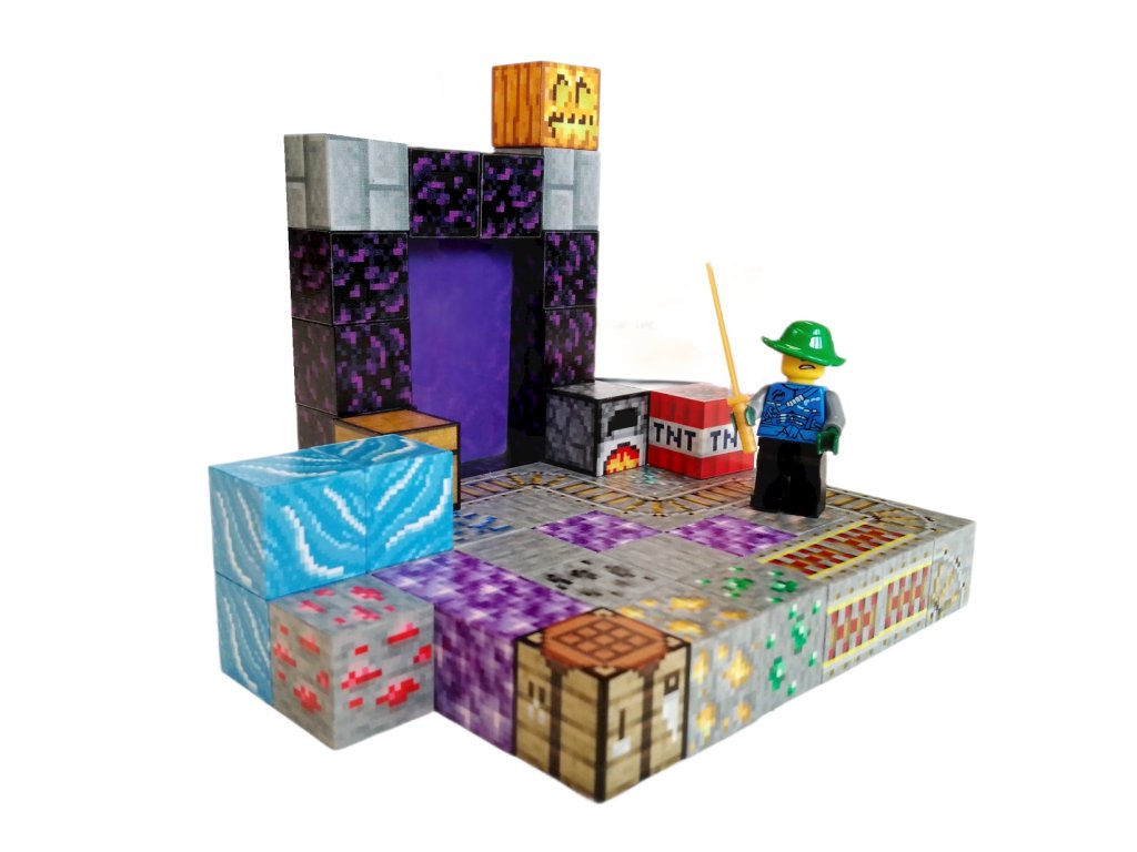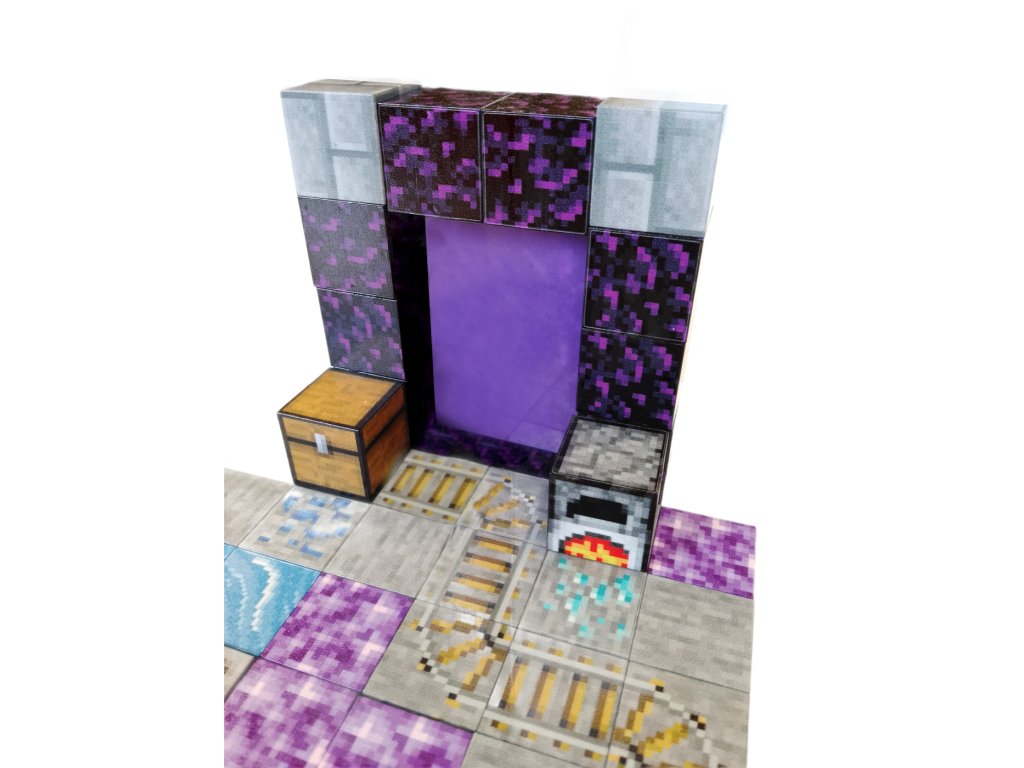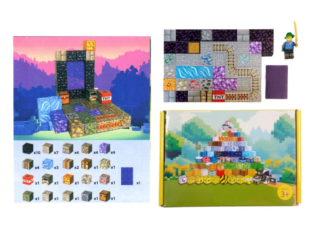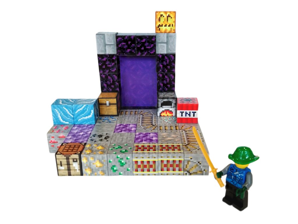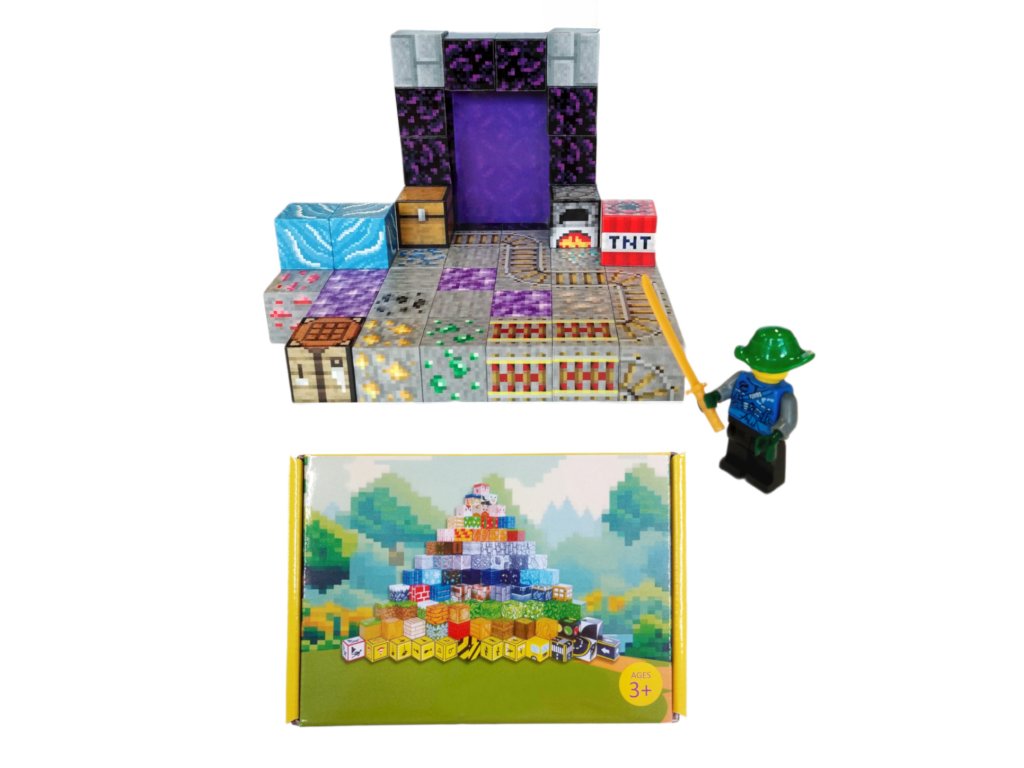 Sada obsahuje 50 dílků, které lze díky magnetům snadno spojovat a rozpojovat. Děti si mohou postavit netherový portál, prostředí s rudami, TNT výbušninou a dalšími herními prvky. Nechybí figurka s plastovým mečem, připravená na boj a průzkum.