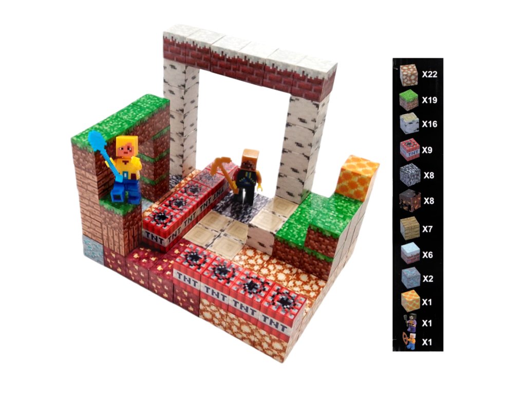 V balení najdete 98 magnetických kostek s různými texturami známými z herního světa Minecraft – nechybí tráva, dřevo, kámen, láva ani ikonické TNT bloky, které dodávají scéně napětí a dobrodružství. Kostky jsou lehké, odolné a vybavené silnými magnety, díky nimž do sebe snadno zapadnou. Děti si mohou postavit vlastní dynamické prostředí plné pastí, portálů a tajných tunelů. Dvě přiložené figurky s nástroji pak slouží k oživení příběhu a podněcují fantazii k nekonečným herním scénářům.