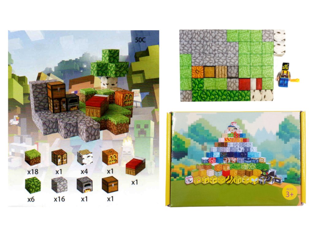 Sada obsahuje 50 kostek s magnetickými spoji, které umožňují snadné a pevné spojování dílků. Děti si mohou sestavit vlastní úkryt s postelí, pecí, truhlou, stromem a dalšími klasickými herními prvky. Součástí je i figurka s pixlovaným vzhledem.