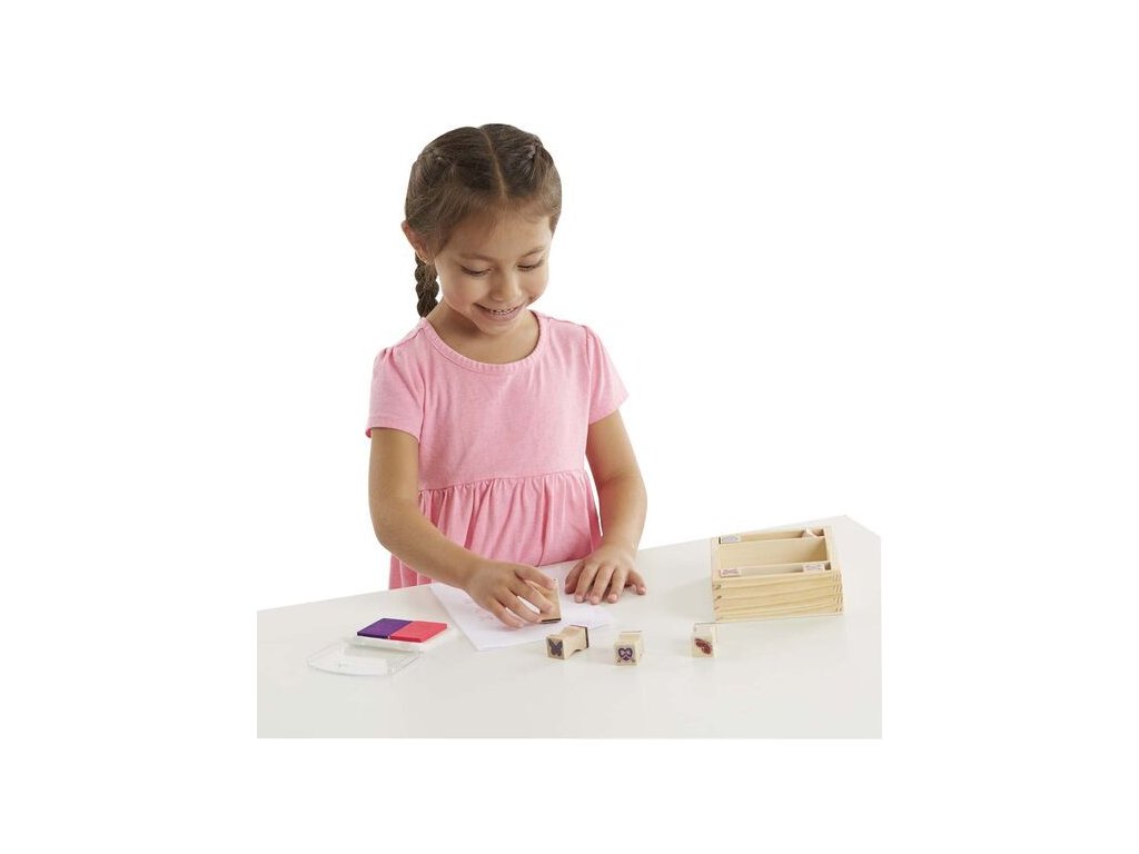 Dřevěná razítka v krabici. Paleta 8 razítek se srdíčky a motýly, 2 polštářky barvy růžové a fialové v dřevěném pouzdře. Zábavné vzory na obrázky pro výtvarné děti, které mohou tvořit svá umělecká díla. Rozměry krabičky: 12 cm x 15 cm Věk: 4+. 1. jakost.Doplňkové parametry