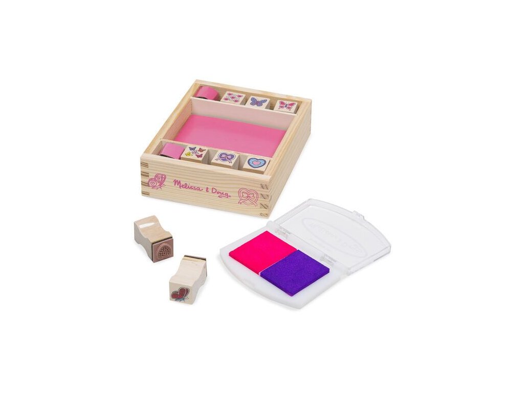 Melissa&Doug Dřevěná razítka v krabici - Motýlci a srdíčka