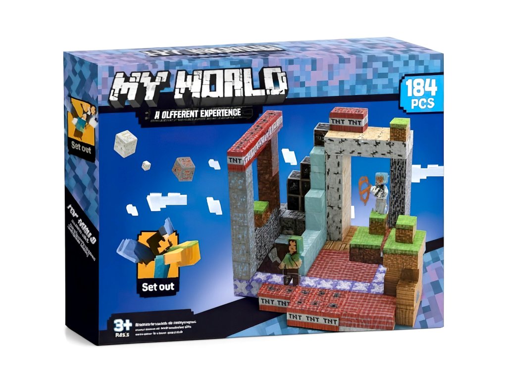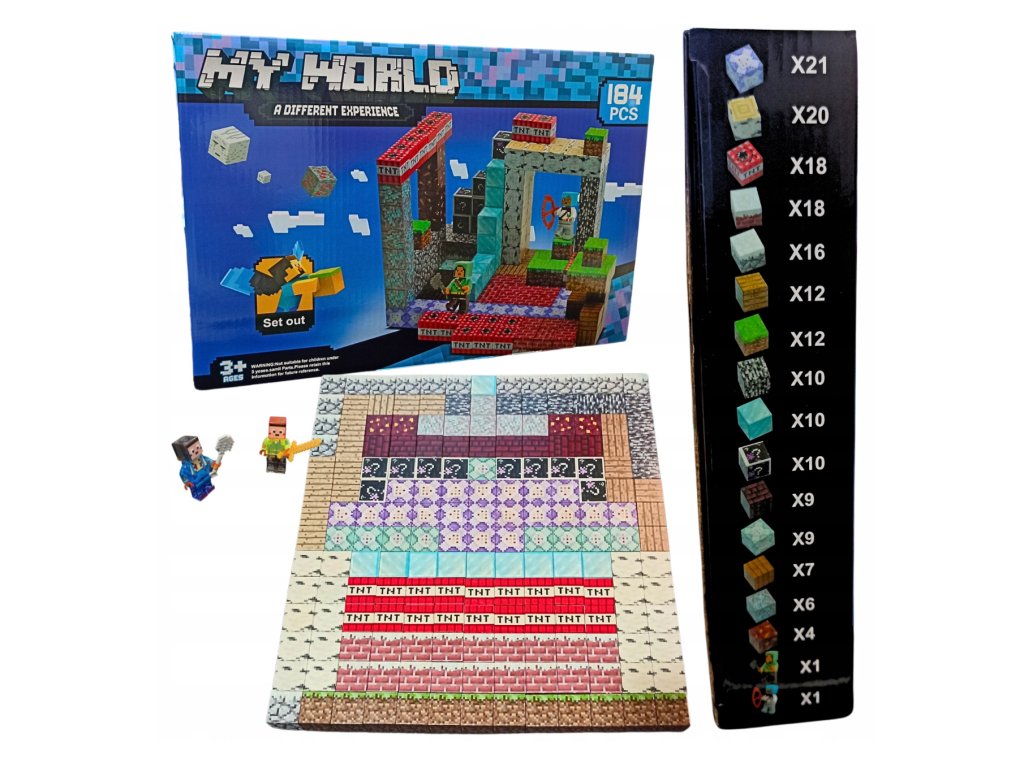 Stavebnice obsahuje 182 dílků s kvalitními magnety, které drží pevně pohromadě a zároveň umožňují snadné přestavování. Bloky jsou potištěny realistickými texturami z Minecraftu, takže každá stavba působí autenticky a okamžitě vtáhne do světa kostiček. V balení najdeš také 2 figurky, se kterými můžeš hned začít objevovat a bojovat.