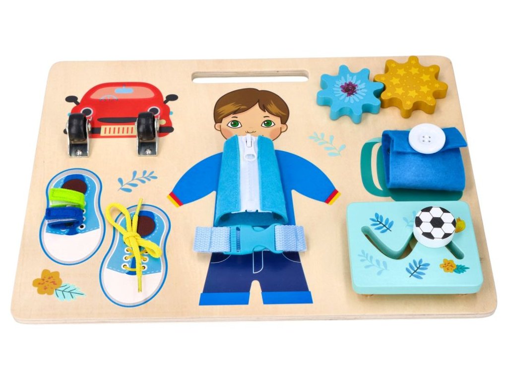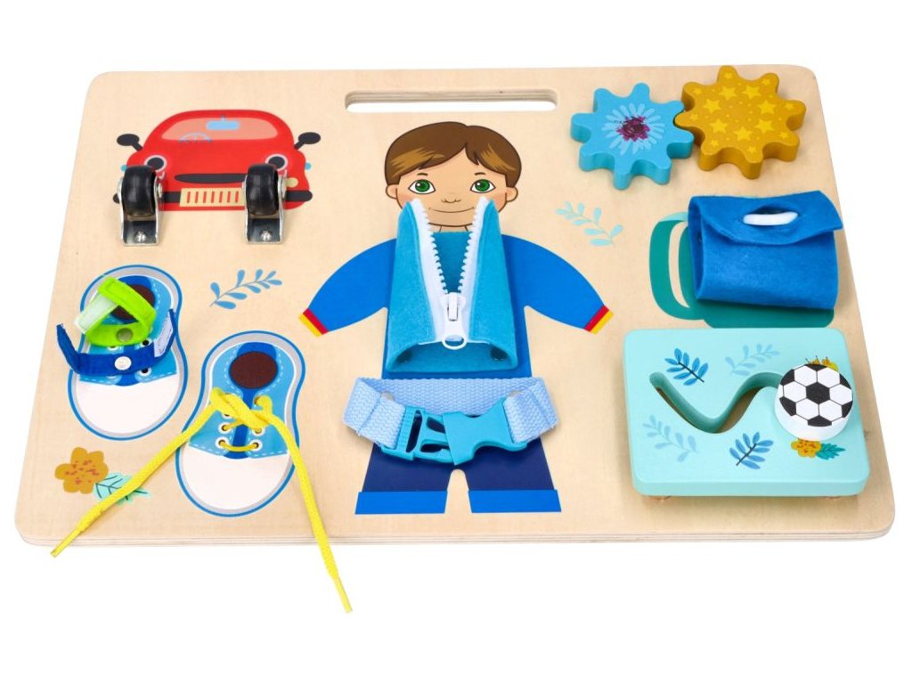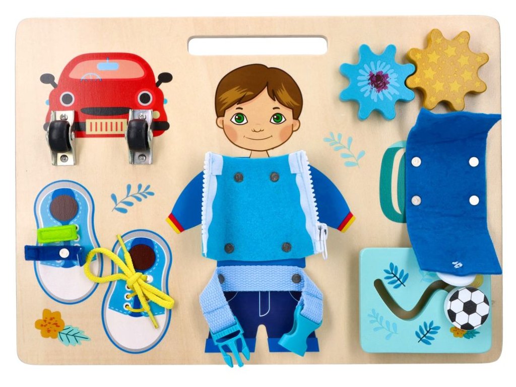 Vzdělávací závěsná, naučná tabule - Adámek. Tato tabule umožní trénink motoriky ruky díky různým zámkům a uzávěrům, které lze otevřít. Najdete zde pohyblivá kola auta, suchý zip a tkaničku, ozubené kolečka, zip, přezku a knoflík a posuvnou kočičku. Učení logického myšlení, každý uzávěr je jiný, navržený tak, aby na to dítě muselo přijít nácvik sebeoblékání. Rozměry: 38 x 27 x 5 cm. Věk: 3 +. CE prohlášení o shodě.Doplňkové parametry