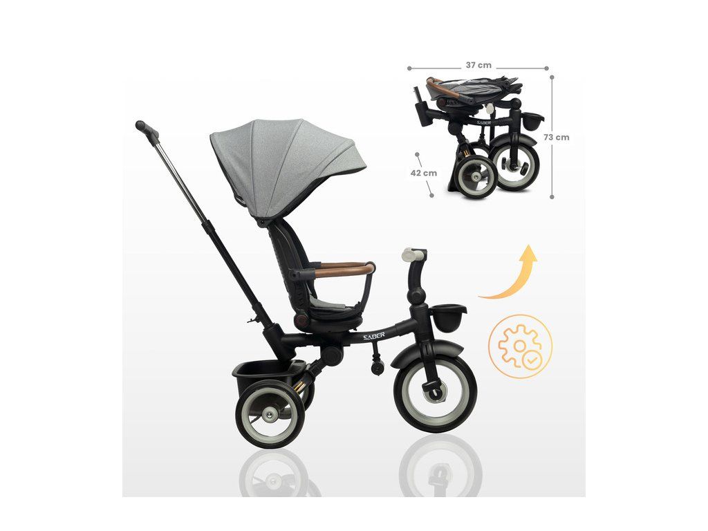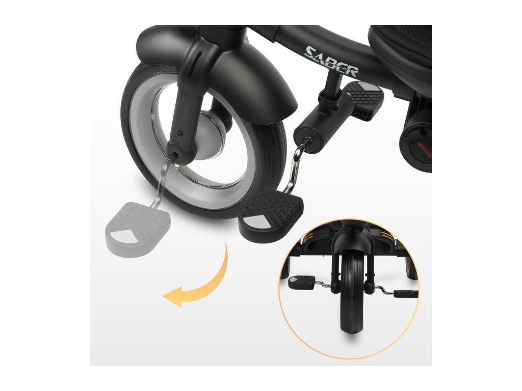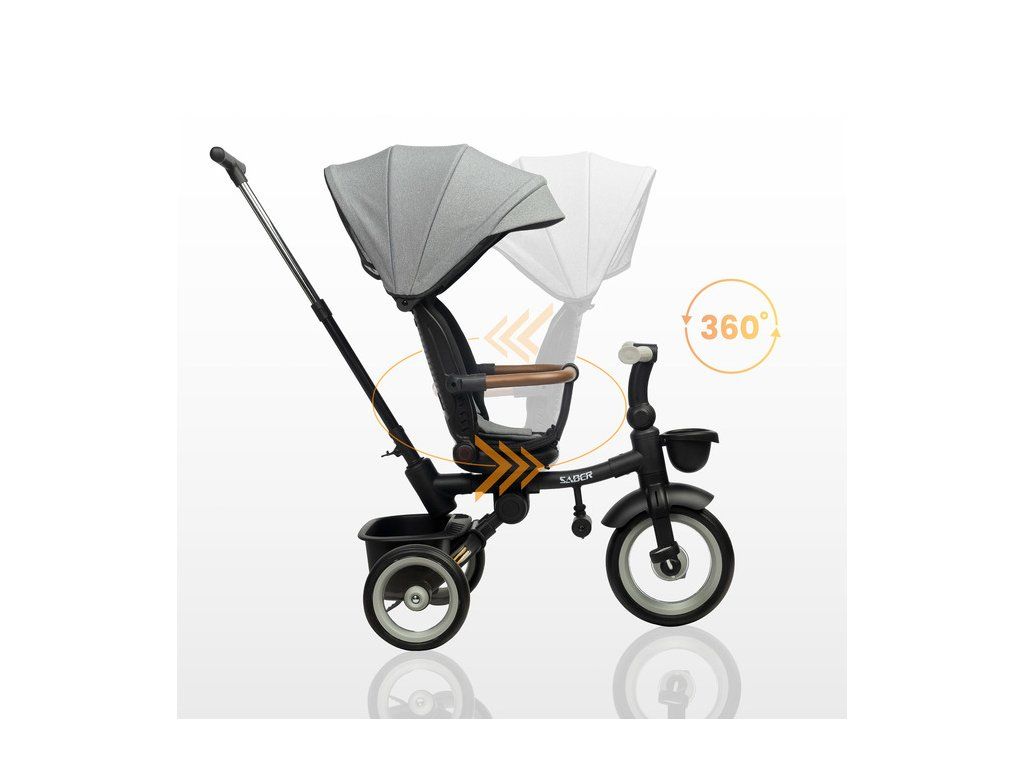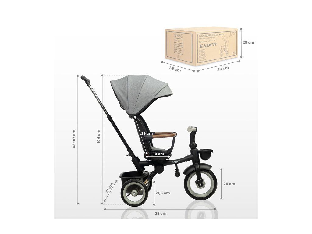 Multifunkční dětská tříkolka SABER: kvalita, bezpečnost a pohodlí. Dětská tříkolka SABER je ideální kombinací funkčnosti, bezpečnosti a moderního designu. Díky modulární konstrukci roste spolu s dítětem a je vhodná pro děti ve věku 3–5 let. Klíčové vlastnosti: Snadná ovladatelnost: Nastavitelná rukojeť pro rodiče zajišťuje pohodlné ovládání ve fázi učení. Komfort dítěte: Otočné sedátko s možností sklopení opěradla a ochranná stříška proti dešti a UV záření. Bezpečnost na prvním místě: 3bodové bezpečnostní pásy, ochranné madlo a odrazky pro vyšší viditelnost. Roste s dítětem: Odnímatelný podnožník a pedály přizpůsobené věku dítěte. Praktické detaily: Úložné koše na drobnosti vpředu i vzadu, snadno skládací konstrukce pro přepravu a skladování. Kvalitní konstrukce: Kovový rám a odolná PU kola zabraňující defektu. Tříkolka SABER poskytuje maximální pohodlí nejen dítěti, ale i rodičům díky přizpůsobitelné rukojeti a nezávislým nožním brzdám. Jednoduchý skládací mechanismus navíc umožňuje snadnou manipulaci a uskladnění. Bezpečnostní pokyny: Produkt je určen pro děti od 3 do 5 let s maximální nosností 25 kg. Dítě musí být vždy pod dozorem dospělé osoby a používat ochranné vybavení (helmu, chrániče). Objevte kvalitu a funkčnost dětské tříkolky SABER, která se stane skvělým společníkem na všech vašich rodinných výletech!Doplňkové parametry