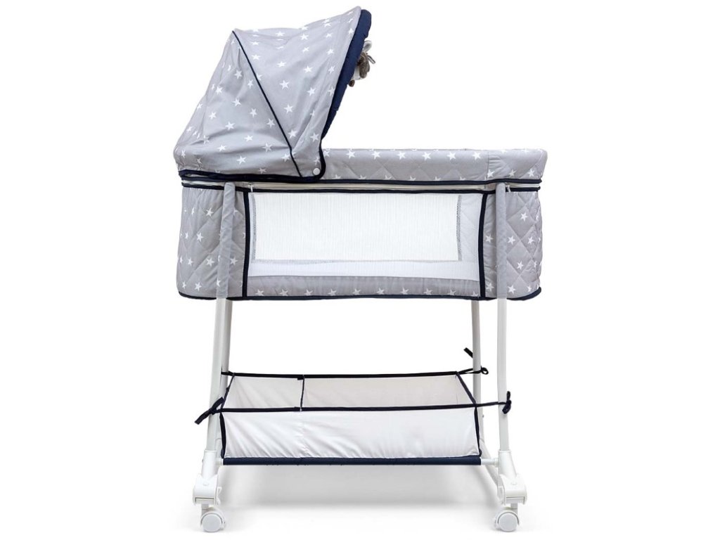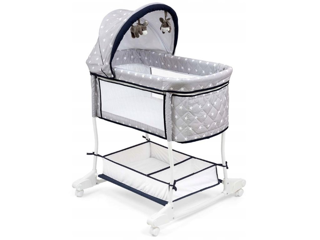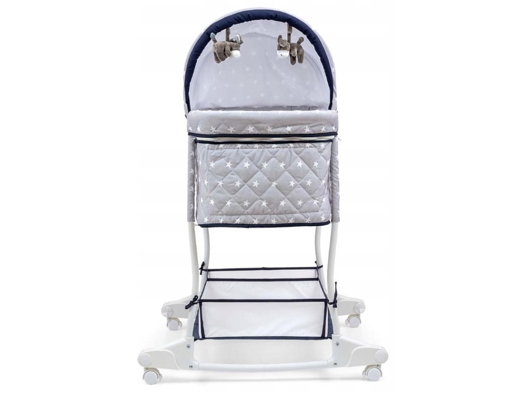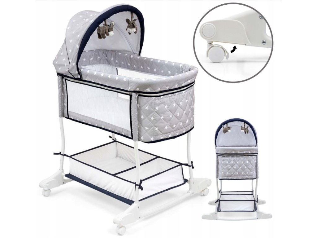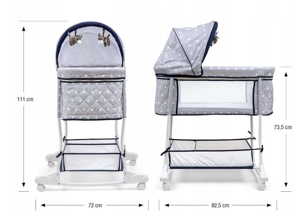 Multifunkční kolébka 2v1 STAR. Nejnovější design kolébky Dream On a použitá technologická řešení jistě osloví rodiče. Tato kolébková postel v sobě spojuje dvě funkce - jako postel pro děti od prvních dnů života a jako kolébku. Kolébka Dream On je vyrobena z nejkvalitnějších materiálů. Kovový rám zaručuje odolnost a odolnost výrobku. Vysoké boční stěny se síťovinou zajišťují dostatečnou cirkulaci vzduchu a umožňují rodiči plnou kontrolu a rychlou reakci, když se dítě probudí. Díky tomu se miminko rychleji zklidní a lépe spí. Charakteristika: - Funkce kolébky. - Funkce lůžka. - Měkká matrace. - Skládací stříška. - Odnímatelná stříška. - 2 hračky zavěšení pod baldachýnem, odnímatelné. - 2 Síťované strany. - 4 Uzamykatelná kolečka. - Snímatelný potah pro praní. - Malé rozměry po složení - Stabilní kovový rám. - Protiskluzové nožičky. - vhodné pro děti do 6ti měsíců - max 9 kg. Rozměry: - Celková délka: 82,5 cm. - Celková šířka: 72 cm. - Výška od podlahy s krytem kolébky: 107 cm. - Výška od podlahy ke gondole v postýlce: 73,5 cm. - Výška od podlahy ke gondole v kolébce: 69,5 cm - Rozměry gondoly: 83 cm x 42,5 cm x 32 cm. - Rozměry košíku na příslušenství: 55 cm x 38 cm x 12 cm.Doplňkové parametry