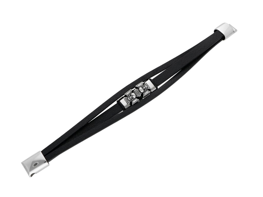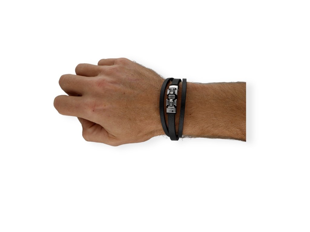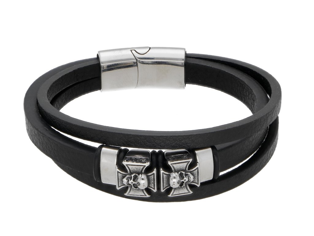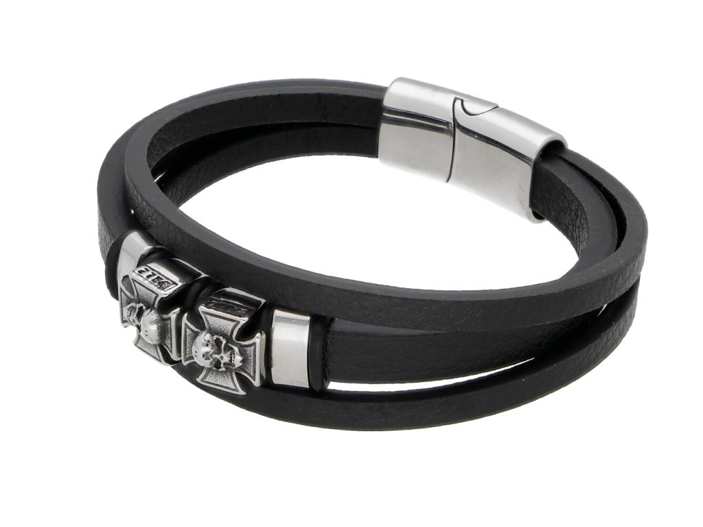 Náramek maltézský kříž černý z kůže a stříbrné oceli + dárkové balení