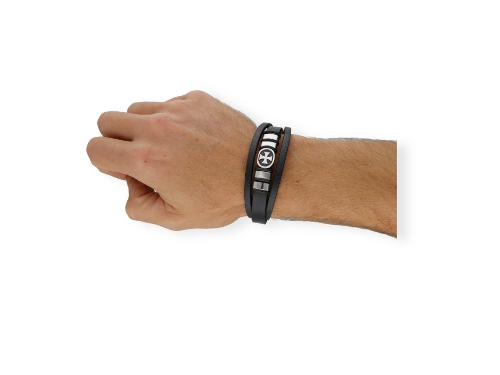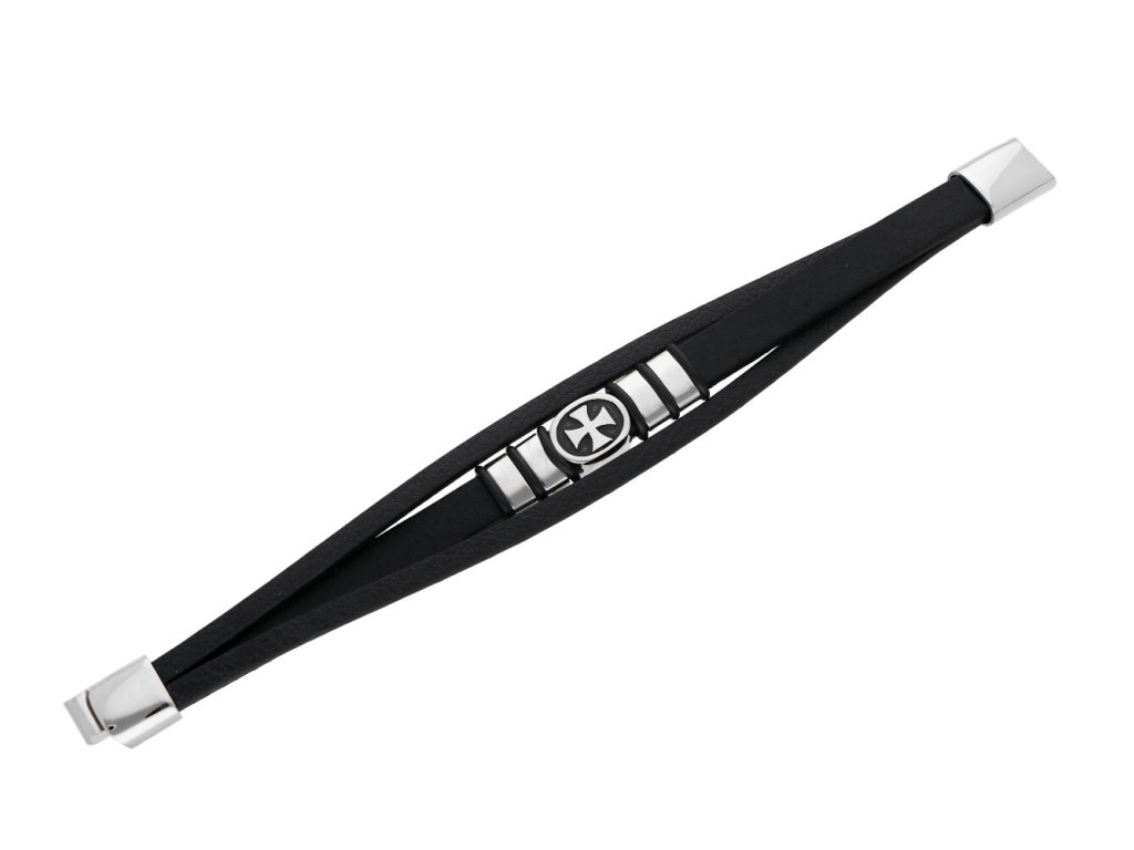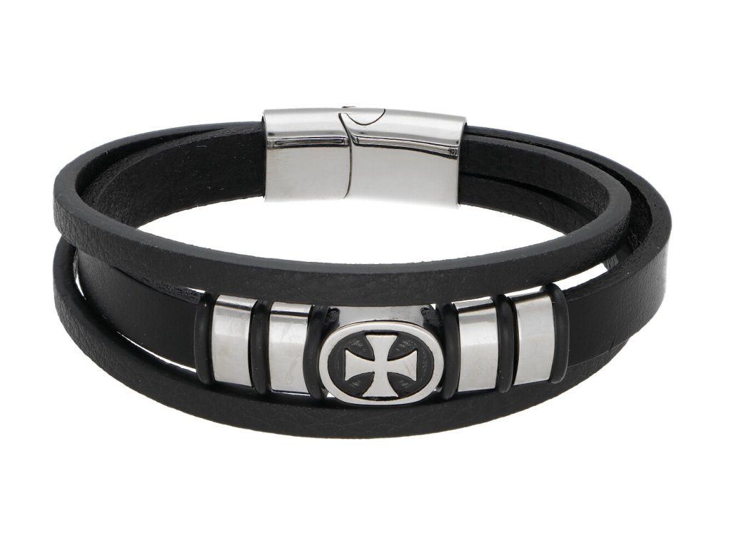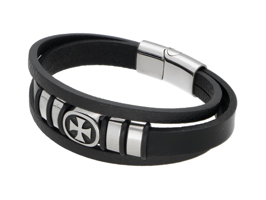 Náramek maltézský kříž černý z kůže a stříbrné oceli + dárkové balení