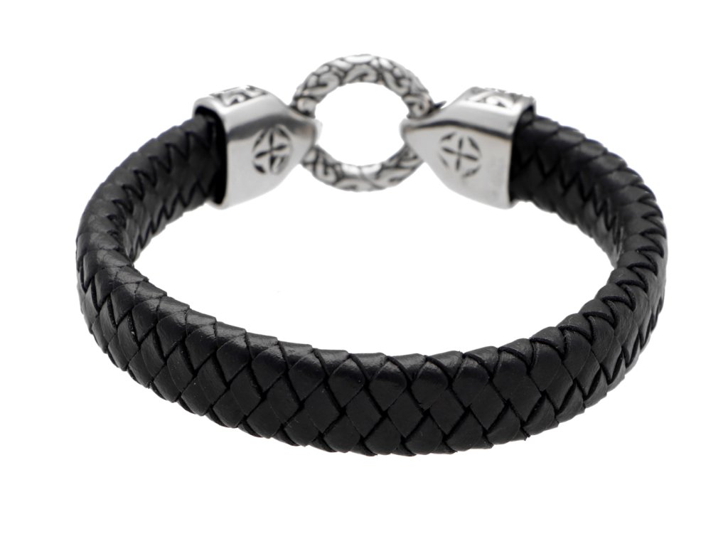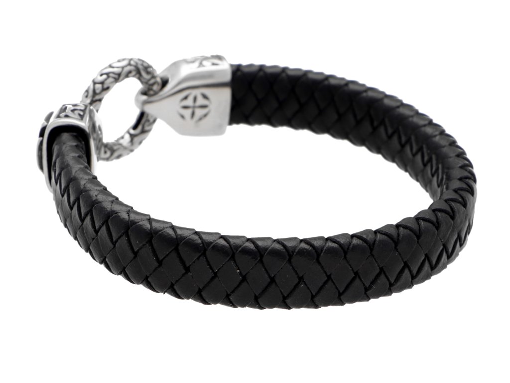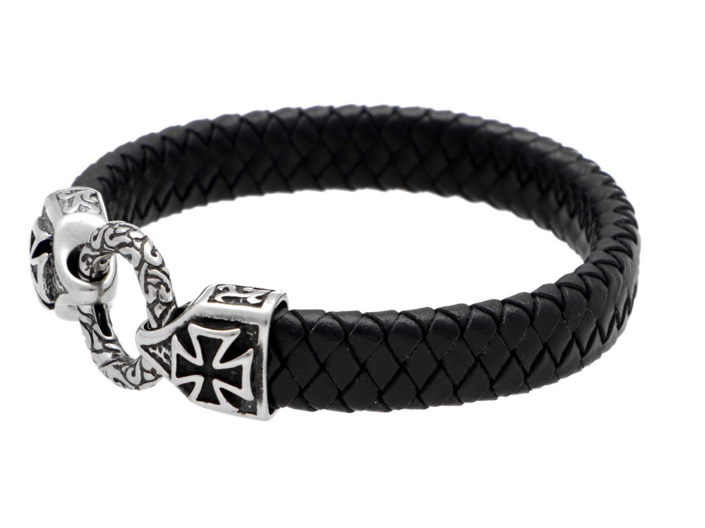 Náramek maltézský kříž pletený černý z kůže a stříbrné oceli + DÁRKOVÉ BALENÍ