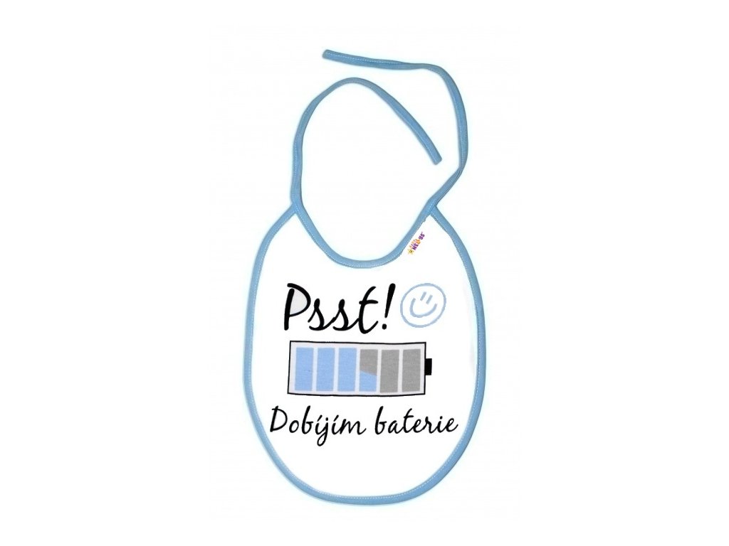 Nepromokavý bryndáček Psst! Dobíjím baterie, 24 x 27 cm - modrý
