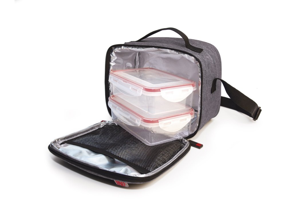 Vnitřní část tašky je tepelně izolovaná a vytváří "efekt ledničky", ta pak lépe chrání jídlo a jeho čerstvost během přepravy. Taška má elegantní, moderní design, rukojeť a nastavitelnou pásku přes rameno. Vnitřní síťovaná kapsa je ideální na ukládání příborů, ubrousků a vnější kapsička je připravena na vaše osobní předměty.