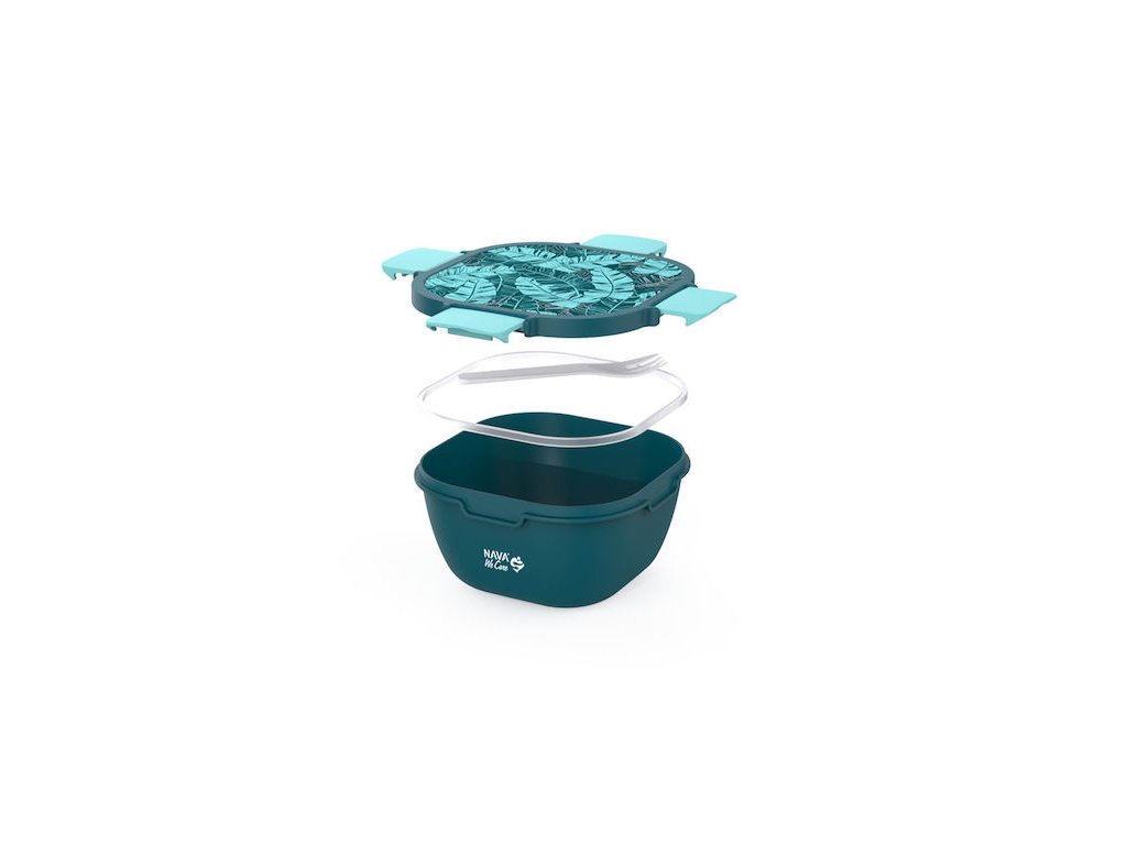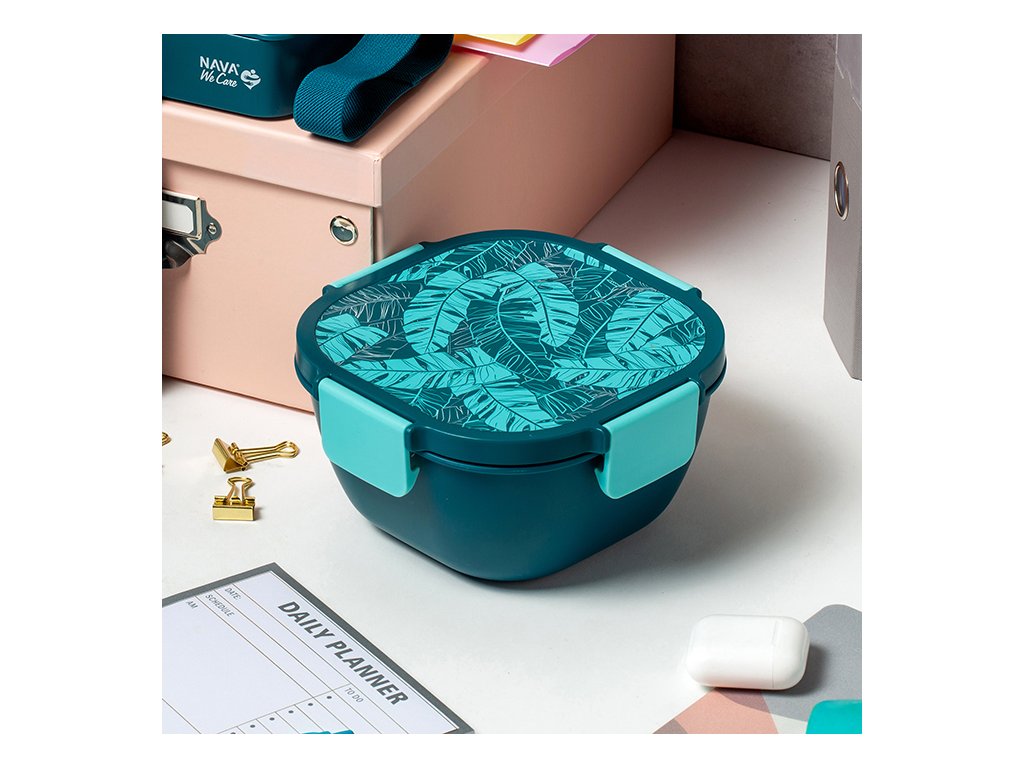 Víko má po stranách klipy pro 4-bodové bezpečné uzavření , aby se zabránilo rozlití během přepravy, a uvnitř je vestavěná vidlička, abyste si jídlo mohli kdykoli vychutnat.