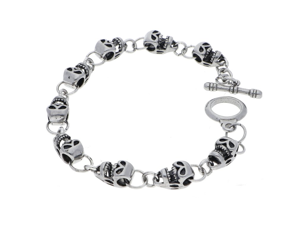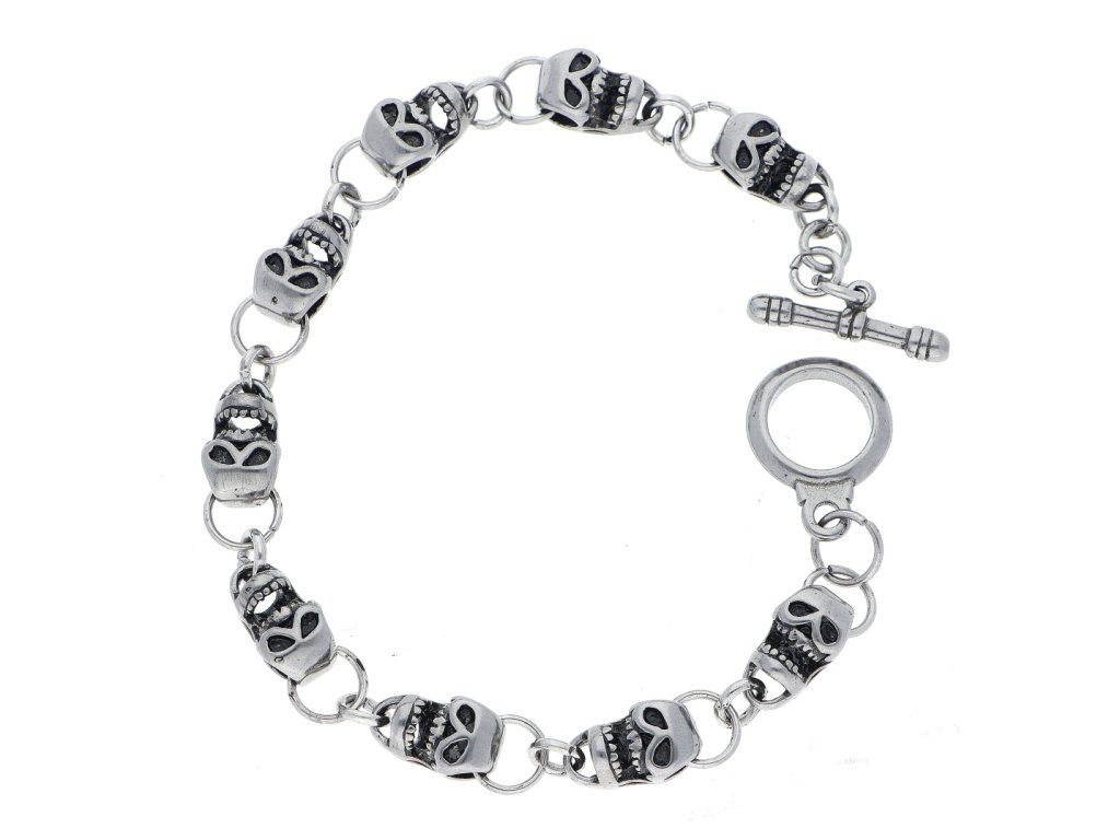 Ocelový náramek zdobený lebkami. Náramek je vyrobený z chirurgické oceli 316L. Ocelový náramek je vyroben z chirurgické oceli s jakostním označením 316L. Finální úprava oceli - leštění, odstraní z náramku veškeré nerovnosti a dodá ocelovému šperku konečný lesk, který přetrvá dlouhá léta.