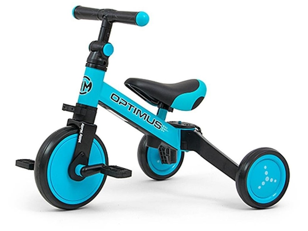 Dětská tříkolka a odrážedlo 3v1 Milly Mally Optimus je skvělým prvním vozítkem pro malé děti. Díky promyšlené konstrukci může růst spolu s dítětem a přizpůsobit se jeho schopnostem. Stabilní tříkolová konstrukce poskytuje bezpečnost při prvních pokusech o jízdu. Jakmile dítě získá více jistoty, lze vozítko jednoduše přeměnit na odrážedlo nebo tříkolku s pedály. Model Optimus pomáhá rozvíjet rovnováhu, koordinaci pohybů a posiluje svaly nohou. Díky tomu je ideální přípravou na jízdu na klasickém dětském kole. Lehká konstrukce, pěnová kola a kompaktní rozměry zajišťují pohodlné používání i snadné přenášení. 3 způsoby použití: 1. tříkolka bez pedálů – ideální pro první zkušenosti dítěte 2. odrážedlo – po spojení zadních kol vznikne klasické balanční odrážedlo 3. tříkolka s pedály – pedály lze připevnit na přední kolo Vlastnosti: ergonomické pohodlné sedadlo nastavitelná výška sedadla pěnová kola pro tichou jízdu pevný ocelový rám pedály na předním kole nastavitelný sklon řídítek omezovač otáčení řídítek skládací zadní vidlice kompaktní konstrukce pro snadné skladování vhodné pro děti od 12 měsíců maximální nosnost 25 kg splňuje evropské bezpečnostní normy Technické údaje: výška: 47,5 cm délka: 58 cm šířka: 45 cm výška sedadla: 27,5–32,5 cm průměr kol: přední 19,5 cm, zadní 15 cm vzdálenost sedadlo–pedály: 28 cm hmotnost: 3,1 kg Rozměry balení: 59 × 19 × 20 cm hmotnost balení: 3,2 kg Součástí balení je montážní návod. Upozornění: Používejte pouze pod dohledem dospělé osoby. Výrobek je určen pro děti v doporučeném věkovém rozmezí uvedeném výrobcem. Před použitím odstraňte veškerý obalový materiál a ochranné prvky. Obal není hračka – uchovávejte jej mimo dosah dětí, aby nedošlo k udušení. Pravidelně kontrolujte stav výrobku a v případě poškození výrobek nepoužívejte. Doporučujeme používat ochranné pomůcky (např. helmu a chrániče).Doplňkové parametry