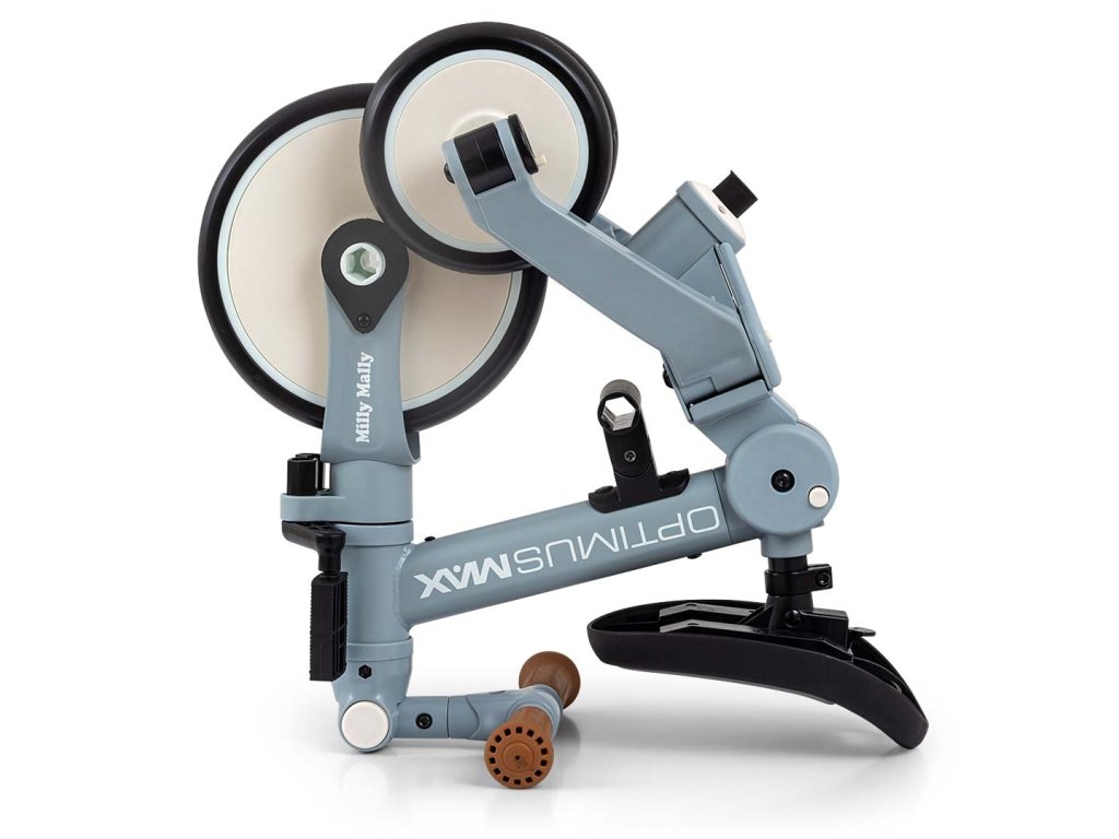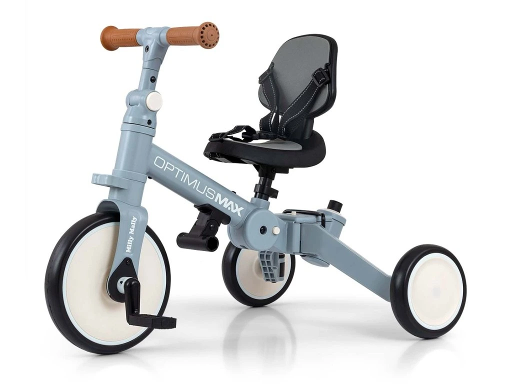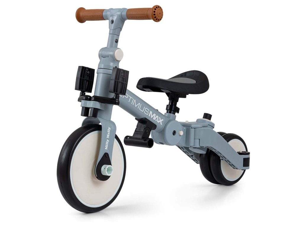 Dětská tříkolka a odrážedlo 5v1 Milly Mally Optimus Max je skvělou volbou jako první vozítko pro vaše dítě. Stabilní tříkolová konstrukce poskytuje bezpečnost a pomáhá dětem získávat nové pohybové dovednosti. Jakmile dítě zvládne základy jízdy a nepotřebuje pomoc rodiče prostřednictvím vodicí tyče, lze vozítko snadno přizpůsobit – přidat pedály nebo jej přeměnit na klasické odrážedlo. Model Optimus Max je vyroben z kvalitních materiálů. Pěnová kola zajišťují pohodlnou a tichou jízdu. Nastavitelná výška a vzdálenost sedadla umožňuje přizpůsobit vozítko růstu dítěte. Omezovač nadměrného otáčení řídítek zvyšuje bezpečnost a pomáhá předcházet pádu. Tříkolka je vybavena také praktickou vodicí tyčí pro rodiče, která pomáhá při jízdě například při únavě dítěte nebo při jízdě ze svahu. Vodicí tyč má 4 stupně nastavení výšky a lze ji snadno demontovat, když dítě povyroste. Vozítko je vhodné pro děti od 12 měsíců. Pomáhá rozvíjet motoriku, posiluje svaly nohou a zlepšuje koordinaci pohybů. Zároveň připravuje dítě na jízdu na klasickém dětském kole. Kompaktní skládací konstrukce usnadňuje transport i skladování. Optimus Max v 5 krocích: 1. tříkolka s pedály jako opěrkami nohou a s vodicí tyčí pro rodiče 2. tříkolové odrážedlo 3. tříkolka s pedály na předním kole 4. odrážedlo s vodicí tyčí pro rodiče 5. klasické odrážedlo Vlastnosti: ergonomické a pohodlné sedadlo nastavitelná výška sedadla 3 stupně nastavení vzdálenosti sedadla 3bodové reflexní bezpečnostní pásy možnost demontáže opěrky sedadla skládací konstrukce pro snadné přenášení pěnová kola pevný ocelový rám vodicí tyč pro rodiče se 4 stupni nastavení pedály na předním kole s možností uložení do držáku pedály mohou sloužit také jako opěrky nohou nastavitelný sklon řídítek omezovač nadměrného otáčení řídítek skládací zadní kola vhodné pro děti od 12 měsíců splňuje evropské bezpečnostní normy Technické údaje: výška: 51 cm délka tříkolky: 66 cm délka odrážedla: 72 cm šířka: 48,5 cm průměr kol: přední 21 cm, zadní 15 cm vzdálenost sedadlo – pedály: 30 / 31,5 / 33 cm vzdálenost sedadlo – řídítka: 11 / 13 / 15 cm výška vodicí tyče: 93,5 – 104 cm výška opěrky zad: 19 cm šířka rukojeti: 26 cm šířka řídítek: 27 cm výška opěrky nohou od země: 12 cm vzdálenost opěrky nohou od sedadla: 23 cm výška sedadla: 30 – 32 cm maximální nosnost: 25 kg hmotnost: 3,8 kg Rozměry balení: 33 × 18,5 × 43 cm hmotnost balení: 4,6 kg Bezpečnostní upozornění: Výrobek je určen pro děti od 12 do 36 měsíců. Maximální nosnost 25 kg. Používejte ochranné pomůcky (helmu, rukavice, chrániče kolen a loktů). Nepoužívejte v silničním provozu. Dítě musí být během používání vždy pod dohledem dospělé osoby. Obal není hračka – uchovávejte jej mimo dosah dětí, aby nedošlo k udušení. Výrobek používejte pouze na bezpečných místech (např. doma, na dvoře nebo na dětském hřišti).Doplňkové parametry