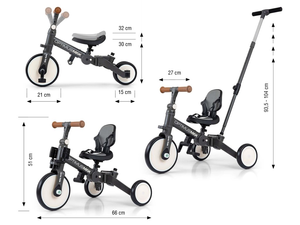 Dětská tříkolka a odrážedlo 5v1 Milly Mally Optimus Max je skvělou volbou jako první vozítko pro vaše dítě. Stabilní tříkolová konstrukce poskytuje bezpečnost a pomáhá dětem získávat nové pohybové dovednosti. Jakmile dítě zvládne základy jízdy a nepotřebuje pomoc rodiče prostřednictvím vodicí tyče, lze vozítko snadno přizpůsobit – přidat pedály nebo jej přeměnit na klasické odrážedlo. Model Optimus Max je vyroben z kvalitních materiálů. Pěnová kola zajišťují pohodlnou a tichou jízdu. Nastavitelná výška a vzdálenost sedadla umožňuje přizpůsobit vozítko růstu dítěte. Omezovač nadměrného otáčení řídítek zvyšuje bezpečnost a pomáhá předcházet pádu. Tříkolka je vybavena také praktickou vodicí tyčí pro rodiče, která pomáhá při jízdě například při únavě dítěte nebo při jízdě ze svahu. Vodicí tyč má 4 stupně nastavení výšky a lze ji snadno demontovat, když dítě povyroste. Vozítko je vhodné pro děti od 12 měsíců. Pomáhá rozvíjet motoriku, posiluje svaly nohou a zlepšuje koordinaci pohybů. Zároveň připravuje dítě na jízdu na klasickém dětském kole. Kompaktní skládací konstrukce usnadňuje transport i skladování. Optimus Max v 5 krocích: 1. tříkolka s pedály jako opěrkami nohou a s vodicí tyčí pro rodiče 2. tříkolové odrážedlo 3. tříkolka s pedály na předním kole 4. odrážedlo s vodicí tyčí pro rodiče 5. klasické odrážedlo Vlastnosti: ergonomické a pohodlné sedadlo nastavitelná výška sedadla 3 stupně nastavení vzdálenosti sedadla 3bodové reflexní bezpečnostní pásy možnost demontáže opěrky sedadla skládací konstrukce pro snadné přenášení pěnová kola pevný ocelový rám vodicí tyč pro rodiče se 4 stupni nastavení pedály na předním kole s možností uložení do držáku pedály mohou sloužit také jako opěrky nohou nastavitelný sklon řídítek omezovač nadměrného otáčení řídítek skládací zadní kola vhodné pro děti od 12 měsíců splňuje evropské bezpečnostní normy Technické údaje: výška: 51 cm délka tříkolky: 66 cm délka odrážedla: 72 cm šířka: 48,5 cm průměr kol: přední 21 cm, zadní 15 cm vzdálenost sedadlo – pedály: 30 / 31,5 / 33 cm vzdálenost sedadlo – řídítka: 11 / 13 / 15 cm výška vodicí tyče: 93,5 – 104 cm výška opěrky zad: 19 cm šířka rukojeti: 26 cm šířka řídítek: 27 cm výška opěrky nohou od země: 12 cm vzdálenost opěrky nohou od sedadla: 23 cm výška sedadla: 30 – 32 cm maximální nosnost: 25 kg hmotnost: 3,8 kg Rozměry balení: 33 × 18,5 × 43 cm hmotnost balení: 4,6 kg Bezpečnostní upozornění: Výrobek je určen pro děti od 12 do 36 měsíců. Maximální nosnost 25 kg. Používejte ochranné pomůcky (helmu, rukavice, chrániče kolen a loktů). Nepoužívejte v silničním provozu. Dítě musí být během používání vždy pod dohledem dospělé osoby. Obal není hračka – uchovávejte jej mimo dosah dětí, aby nedošlo k udušení. Výrobek používejte pouze na bezpečných místech (např. doma, na dvoře nebo na dětském hřišti).Doplňkové parametry