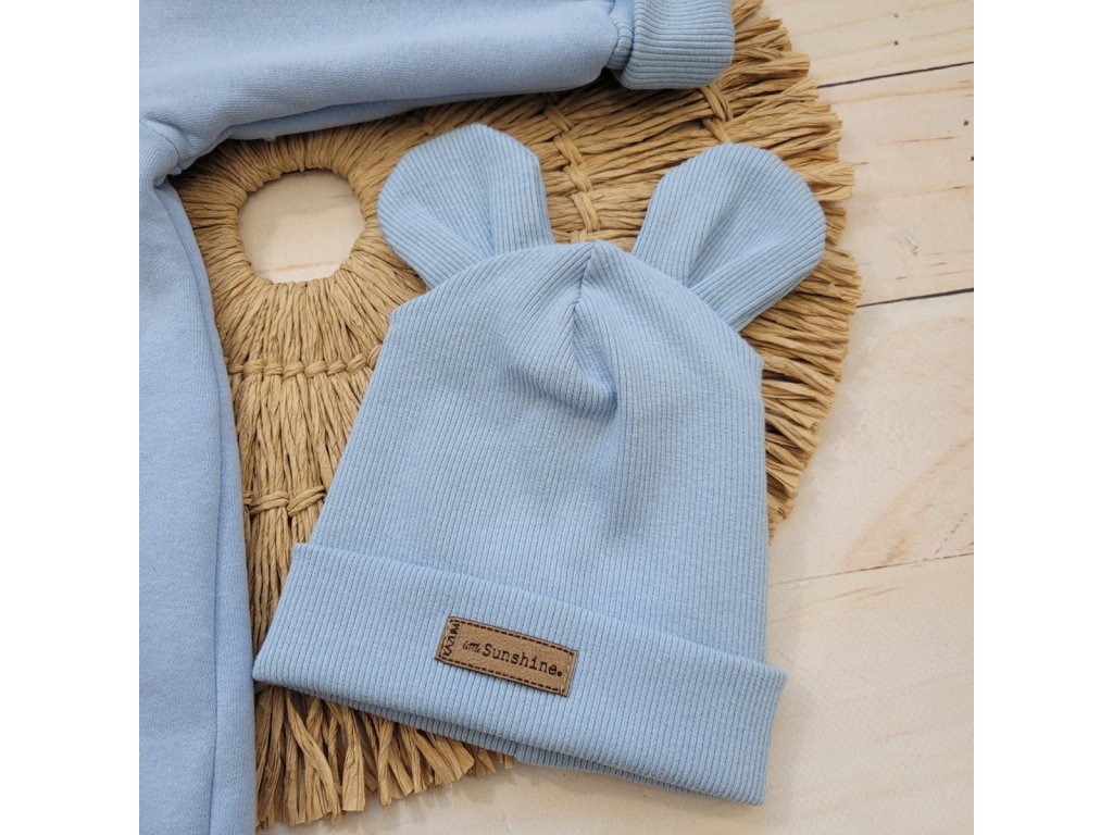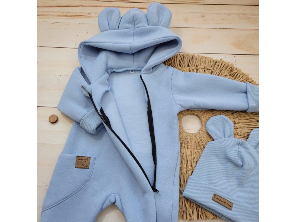 Oteplený dětský overal bez šlapek s kapucí + čepička, 2D, modrý