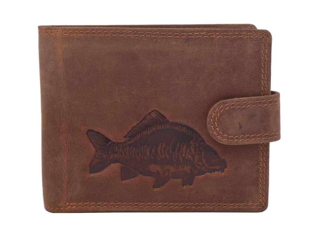 Stylová pánská peněženka se zapínáním z hnědé hovězí kůže potěší každého vášnivého rybáře. Její dominantou je detailní tištěný motiv kapra, který jí dodává osobitý charakter. Kvalitní zpracování, praktické členění na karty, bankovky i mince a bezpečné zapínání dělají z této peněženky ideální dárek i spolehlivý každodenní doplněk. Díky přírodnímu vzhledu a odolnému materiálu vydrží dlouhá léta používání. Originální design zároveň podtrhne vaši zálibu a přinese kousek přírody do každodenního života.