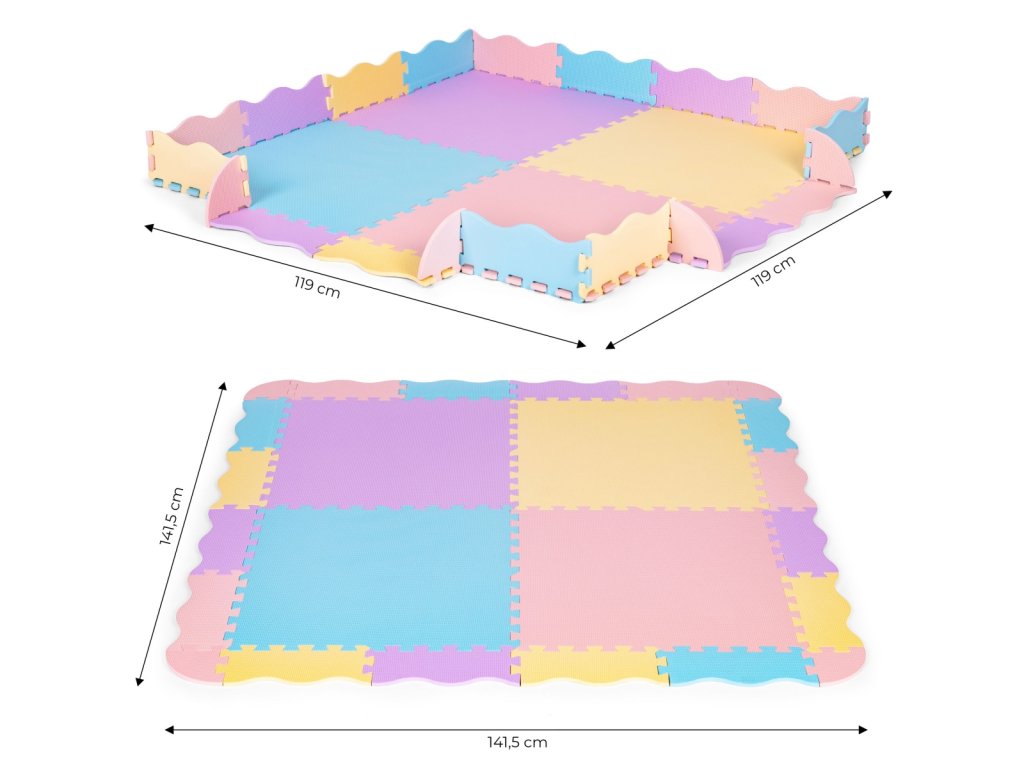Pěnová edukativní podložka – puzzle s ohrádkou Měkká, bezpečná a kreativní plocha pro vaše dítě. Vhodná pro děti od 12 měsíců věku. Ideální na hraní, lezení i první krůčky. Podložka se spojuje jako puzzle. Možnost sestavení s ohrádkou (mantinelem). Celkový rozměr: 141,5 × 141,5 cm. Počet dílků: 24. Tloušťka: 1 cm. Vyrobena ze speciální certifikované pěny EVA. Možnost libovolného tvarování a sestavení. Vhodná pro všechny typy podlah. Snadná údržba – stačí otřít vlhkým hadříkem. Izoluje chlad od podlahy a chrání dítě při hraní. Bezpečný, netoxický materiál – vhodný pro děti. Ideální pro malé děti. Malé děti tráví spoustu času na podlaze, kde si hrají, lezou a objevují svět kolem sebe. Aby se cítily pohodlně a v bezpečí, tato pěnová podložka zajistí měkký, teplý a bezpečný prostor pro každodenní aktivity. Je ideální pro hraní, lezení, první krůčky, odpočinek nebo i jako pikniková deka. Podložku lze snadno přeměnit na ohrádku – mantinel, který pomáhá udržet dítě v bezpečí, chrání ho při hře a zabraňuje, aby hračky nebo míčky opouštěly vymezený prostor. Promyšlený design pro maximální pohodlí. Podložka se skládá ze 4 hlavních čtverců a 18 doplňkových dílků, které mají speciální zoubky umožňující snadné spojování do různých tvarů. Tloušťka 1 cm zajišťuje dokonalou měkkost, izolaci od chladu a ochranu při pádu. Povrch podložky má protiskluzovou strukturu, která zabraňuje klouzání a je zcela bezpečná pro malé děti. Materiál EVA je měkký, pružný a odolný – ideální pro každodenní používání. Suchý bazének – zábava na maximum. Díky přídavným mantinelům lze podložku přetvořit na “suchý bazének”, který se rychle stane oblíbeným místem všech dětí. Stačí dovnitř nasypat barevné míčky nebo malé hračky a zábava může začít. Dítě si tak bezpečně hraje, rozvíjí pohyb i smysly v měkkém a chráněném prostoru. Technické údaje. Věk dítěte: od 12 měsíců. Materiál: EVA pěna (certifikovaná, netoxická). Hmotnost: 1,64 kg. Počet dílků: 24. Rozměr složené podložky: 141,5 × 141,5 cm. Rozměr ohrádky (suchého bazénku): 119 × 119 cm. Tloušťka: 1 cm. Bezpečnostní pokyny. Vhodné pro děti od 12 měsíců. Používejte pouze pod dohledem dospělé osoby. Před prvním použitím odstraňte obalové materiály a otřete povrch vlhkým hadříkem. Nepoužívejte v blízkosti ohně ani na kluzkém povrchu. Pravidelně kontrolujte stav podložky a spojů. Podložka splňuje evropské bezpečnostní normy. Materiál EVA je bez BPA, ftalátů a dalších škodlivin. Barvy se mohou mírně lišit v závislosti na nastavení monitoru. Fotografie jsou ilustrační. Tip pro rodiče: Vytvořte dětem jejich vlastní bezpečné místo na hraní. Stačí pár míčků, plyšáků nebo kostek a z pěnové podložky se stane oblíbené hrací hřiště přímo u vás doma.Doplňkové parametry