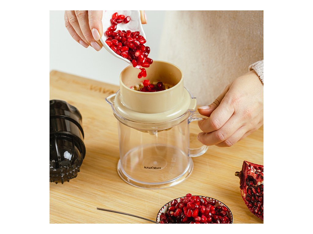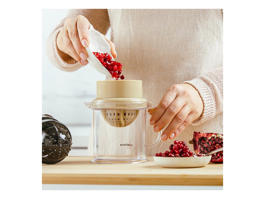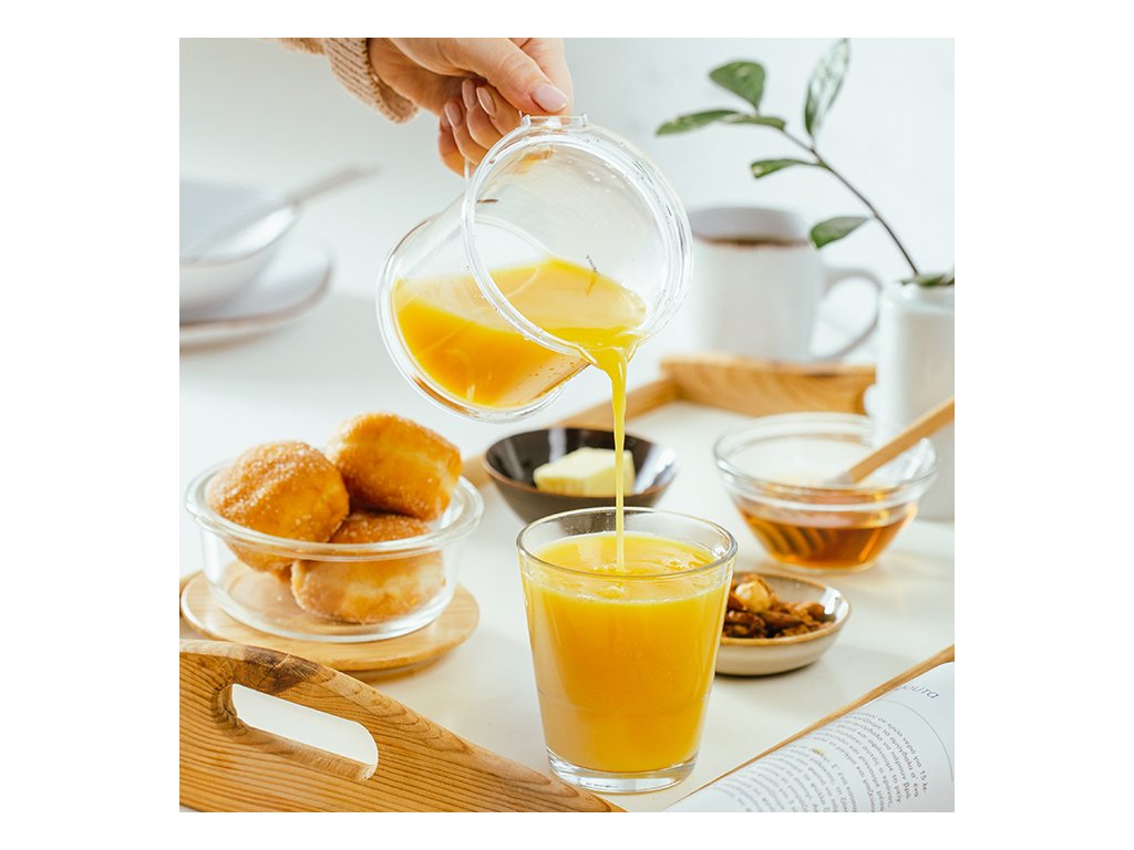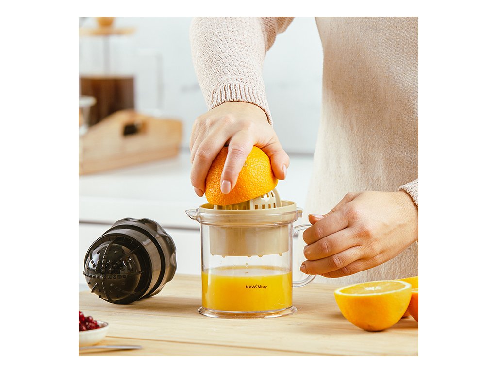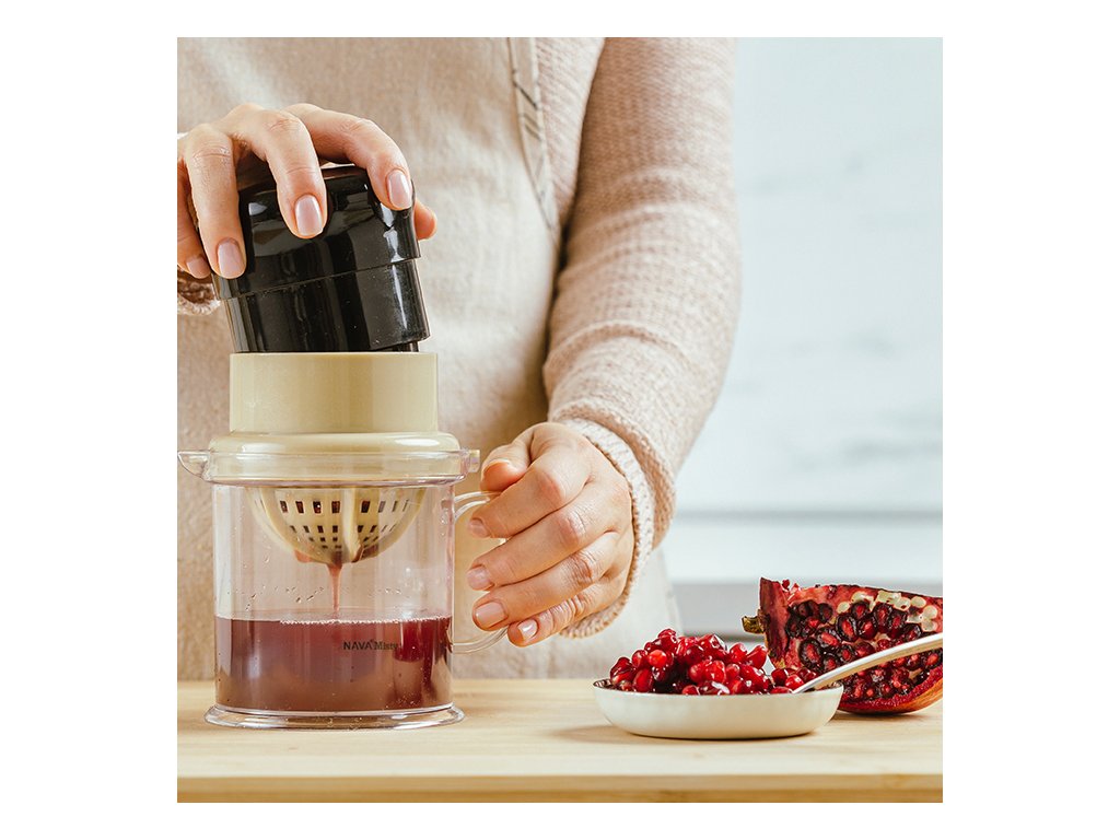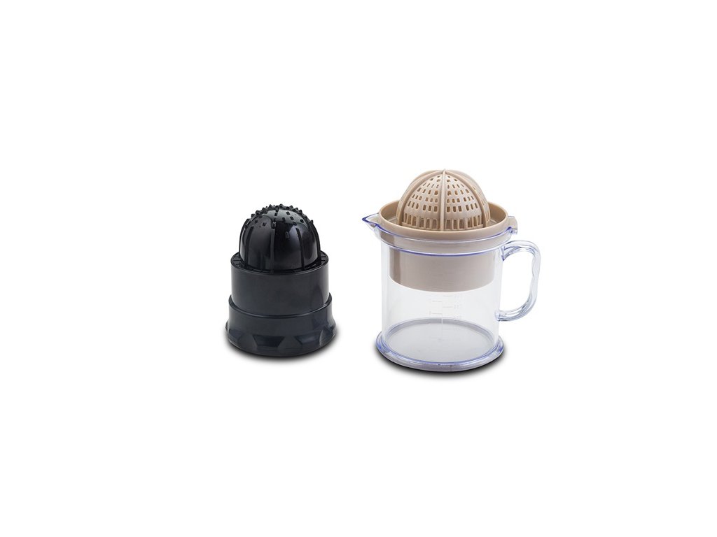 Odšťavňovač má objem 0,5l; jednoduše vložte ovoce do sítka a lisujte je otáčením odnímatelného uzávěru lisu, abyste oddělili šťávu od pecek a dužiny. Otočením sítka, které slouží jako sběrač pecek, máte okamžitě k dispozici odšťavňovač na lisování citrusových plodů.