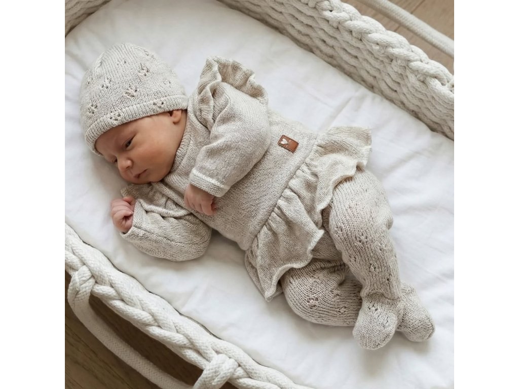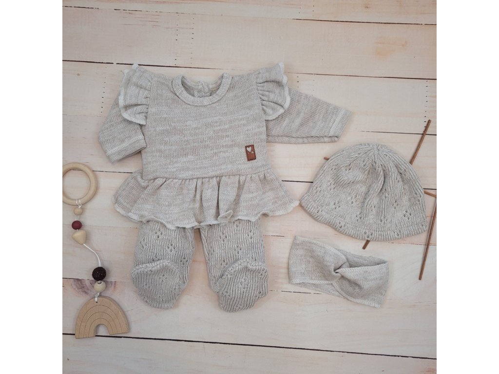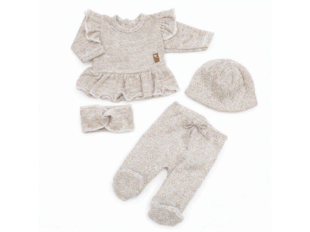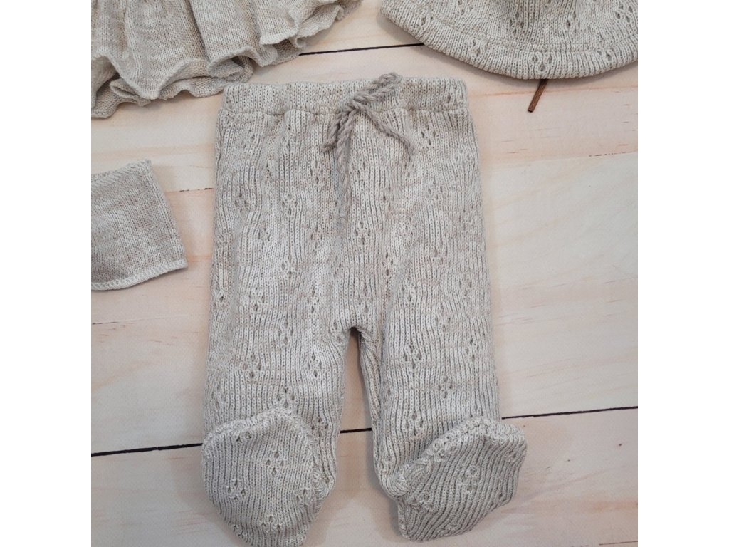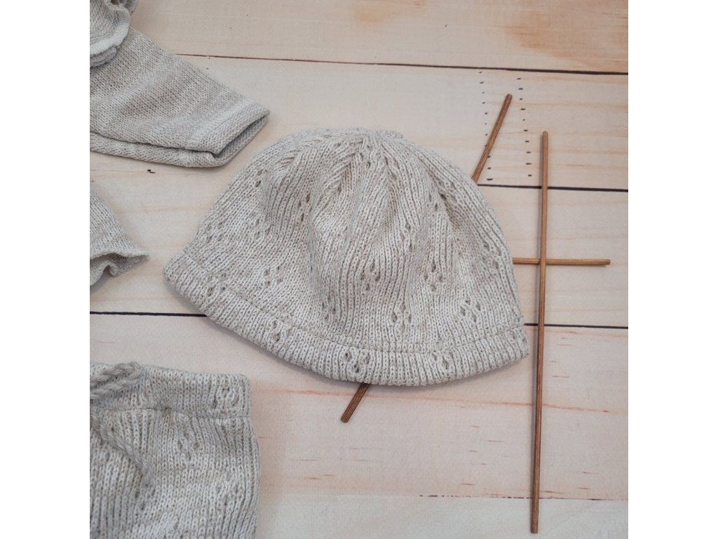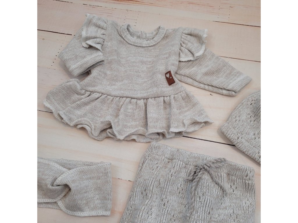 Pletená ažurková sada 4D, tunika, polodupačky, čepička + čelenka, oříšková
