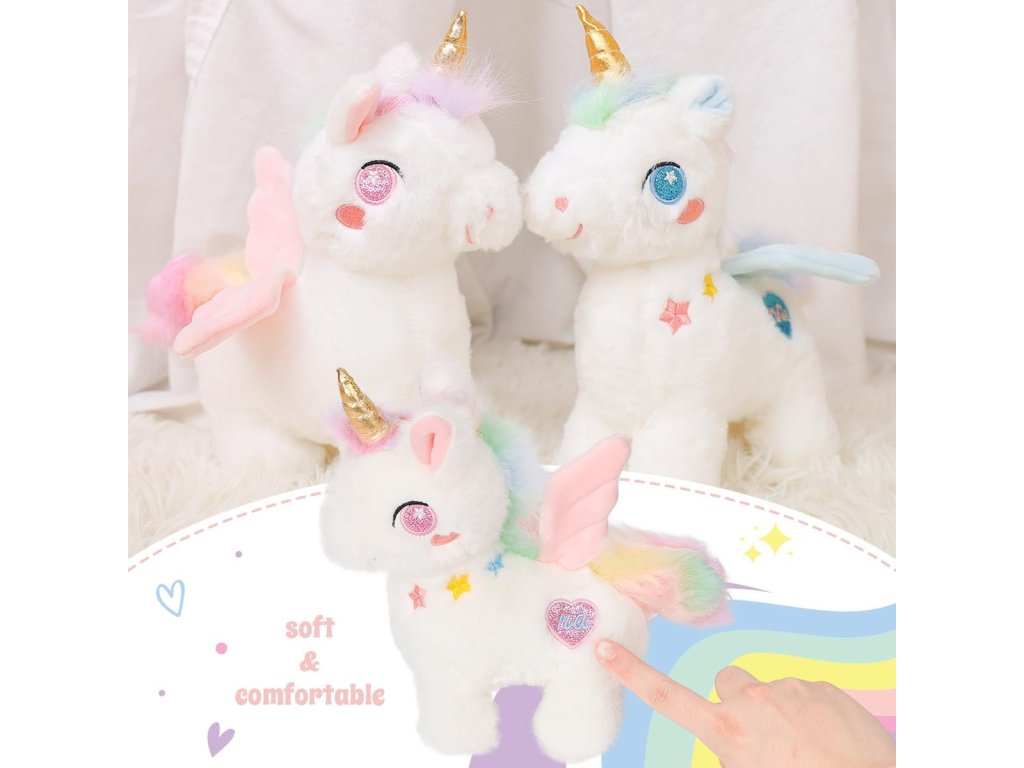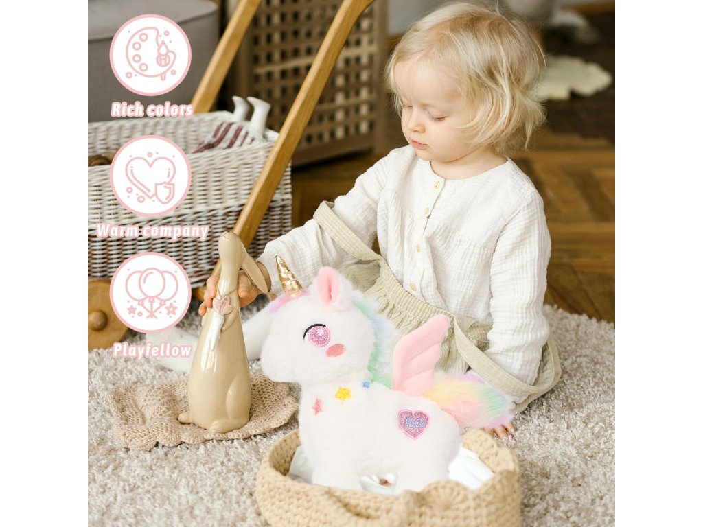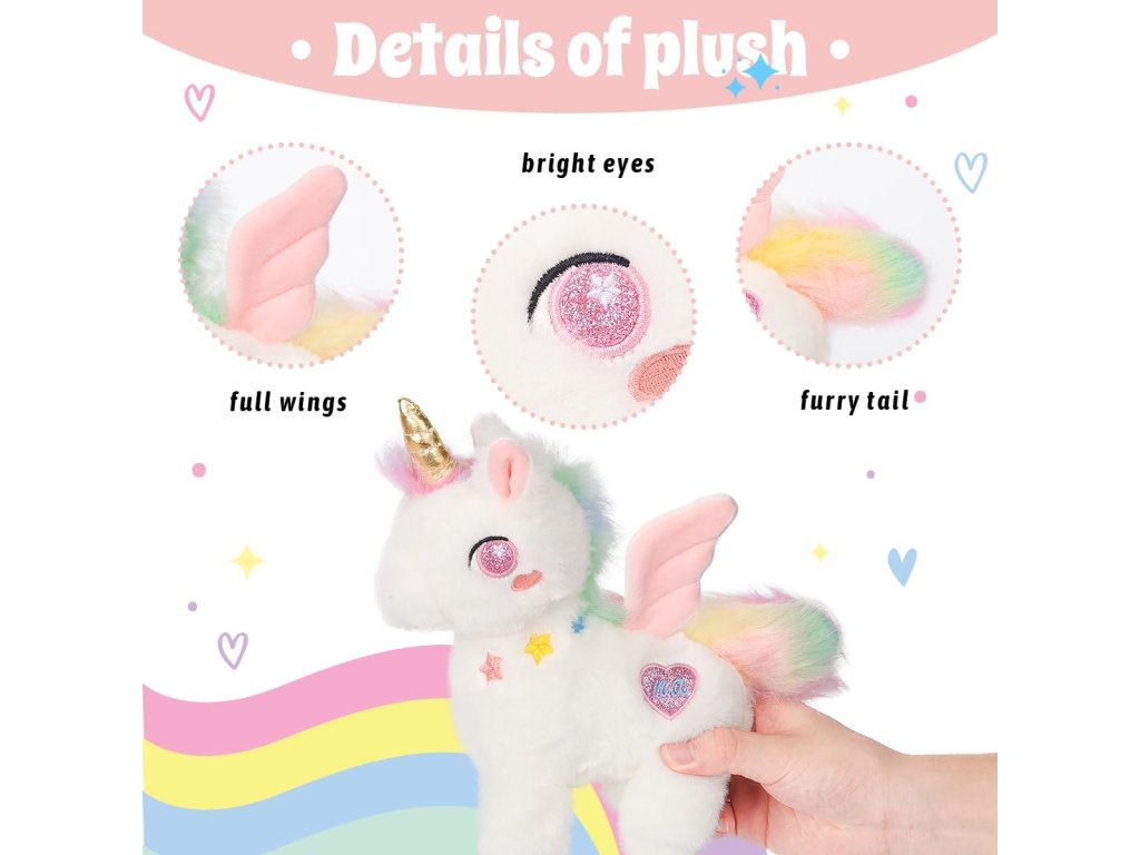 Její duhový ocas a křídla v pastelových barvách dodávají hračce jemný a magický vzhled, který si děti okamžitě zamilují. Zářivě růžové třpytivé oči a zlatý roh jí propůjčují jedinečný pohádkový šarm.