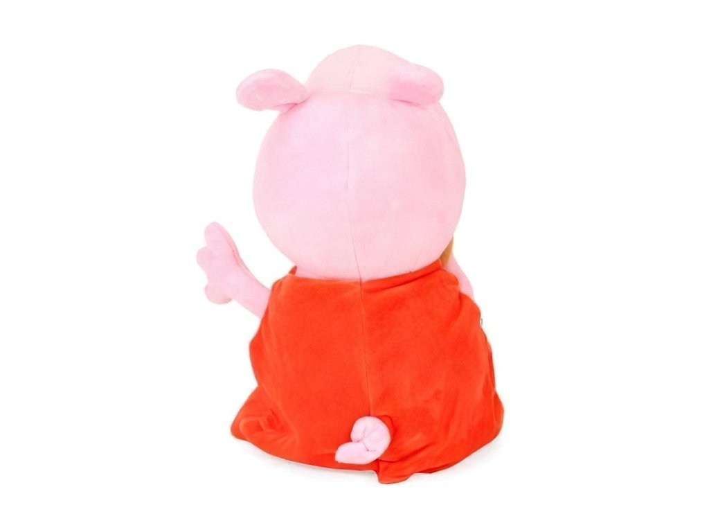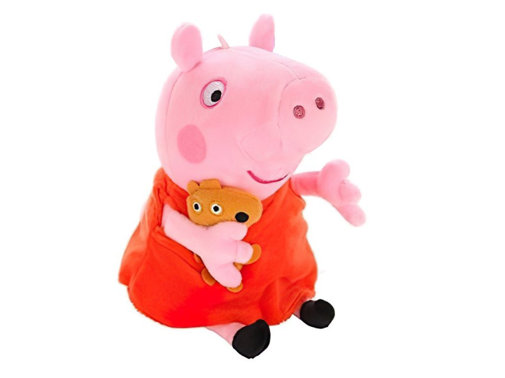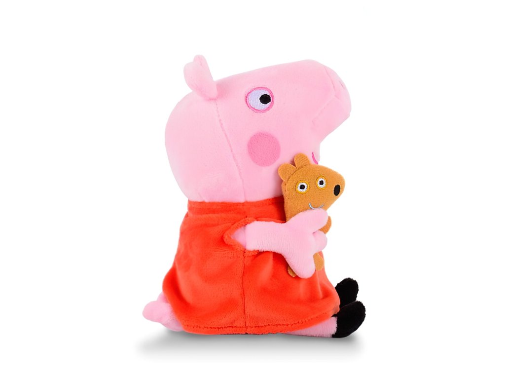 Peppa je zobrazena ve své klasické podobě – s růžovým čumáčkem, červenými šatičkami a oblíbeným plyšovým medvídkem Teddy, kterého si drží v náručí. Tato věrná podoba z ní dělá ideálního parťáka pro každodenní hry i večerní usínání.