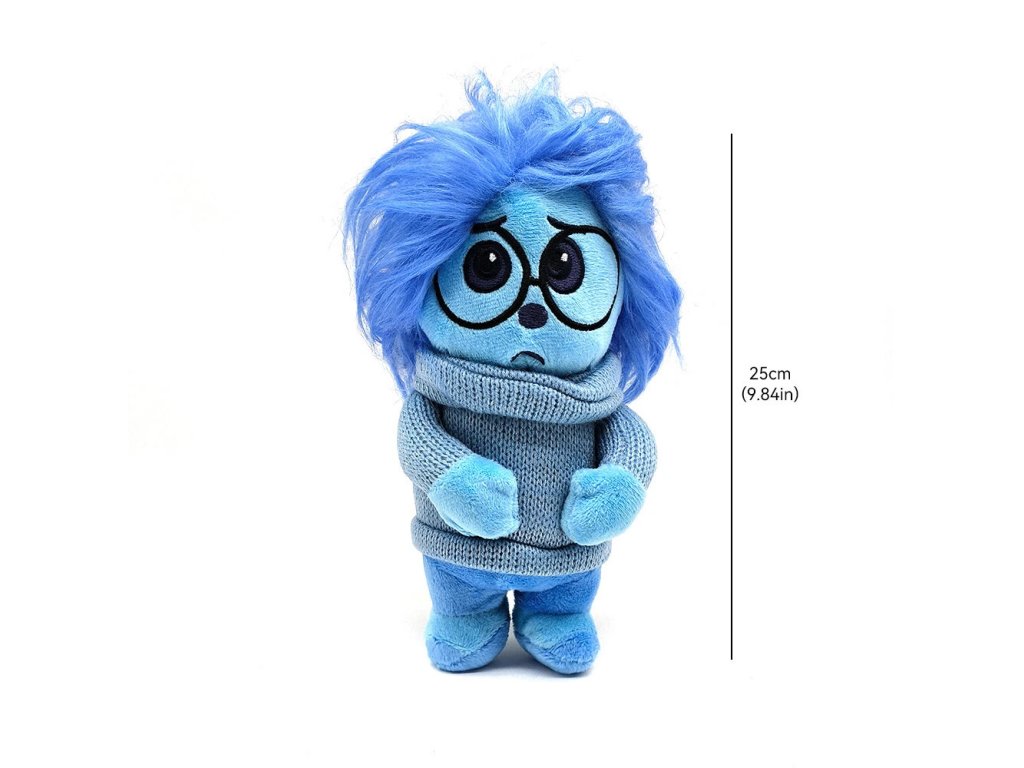 Tato postavička měří přibližně 23 cm a zachycuje věrně svůj filmový předobraz – modrá barva, velké brýle a jemný výraz v obličeji tvoří ikonický vzhled postavy Smutku. Hračka je vyrobena z měkkého plyšového materiálu, který je hebký na dotek a bezpečný i pro nejmenší děti. Detailní zpracování, včetně pleteného svetru a výrazu smutku v očích, dodává hračce autentický vzhled. Pevné švy a kvalitní provedení zaručují její dlouhou životnost.