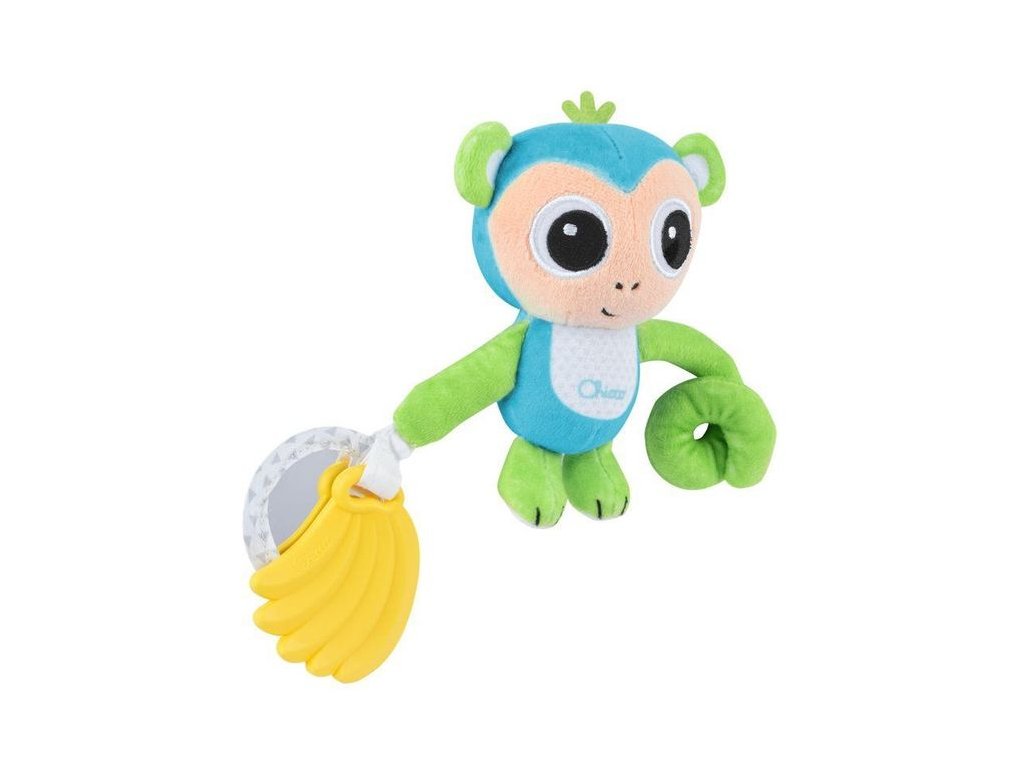 Veselá opička s chrastítkem Chicco. Tato rozkošná opice má dlouhou a pružnou tlapku, která vám umožní snadno ji připevnit na kočárek, kočárek nebo autosedačku a doprovázet vaše dítě v jakékoli situaci. Na druhé tlapce jsou dva přívěsky: kousátko ve tvaru banánu z měkkého plastu, které pomůže miminku v období prořezávání zoubků. Druhým přívěskem je zrcátko, které přitahuje pozornost dítěte pomocí světelných efektů. Uvnitř hračky je chrastítko, které navíc stimuluje zájem miminka. Vhodné pro děti od 3 měsíců. Rozměry balení: 14 x 15 x 5,5 cm.Doplňkové parametry