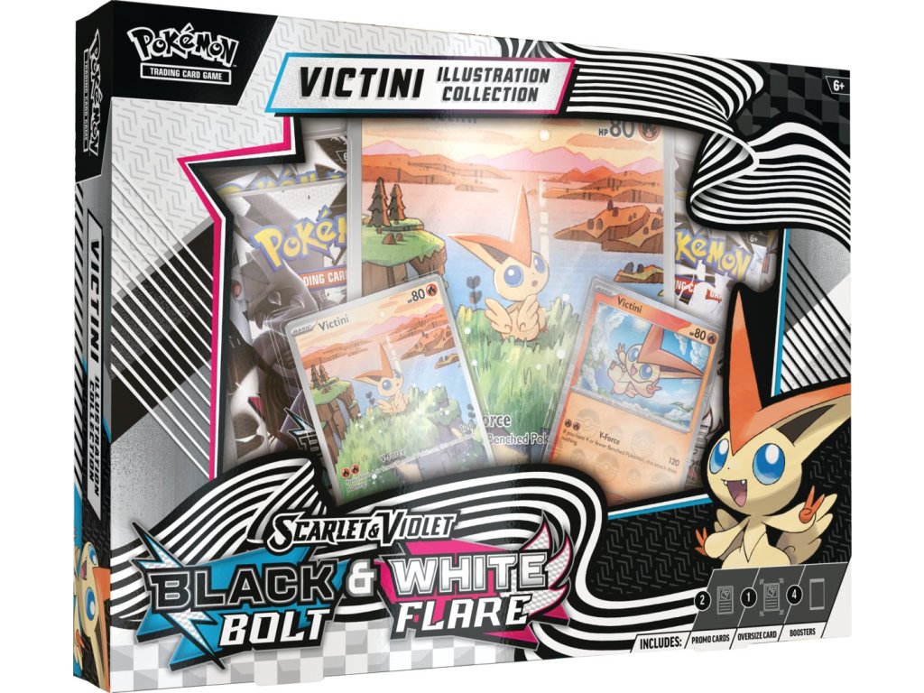 Obsah balení:\n• 1 full-art foilová promo karta Victini\n• 1 premium parallel foilová karta Victini\n• 1 oversize illustration rare-style foilová promo karta Victini\n• 2 Boostery Pokémon TCG: Scarlet & Violet—Black Bolt\n• 2 Boostery Pokémon TCG: Scarlet & Violet—White Flare\n• přístupový kód pro Pokémon TCG LiveDoplňkové parametry