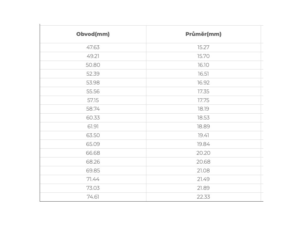 - Velikost průměru v mm lze dle přiložené tabulky přepočítat i na obvod. Každý obchod tento údaj uvádi jinak .