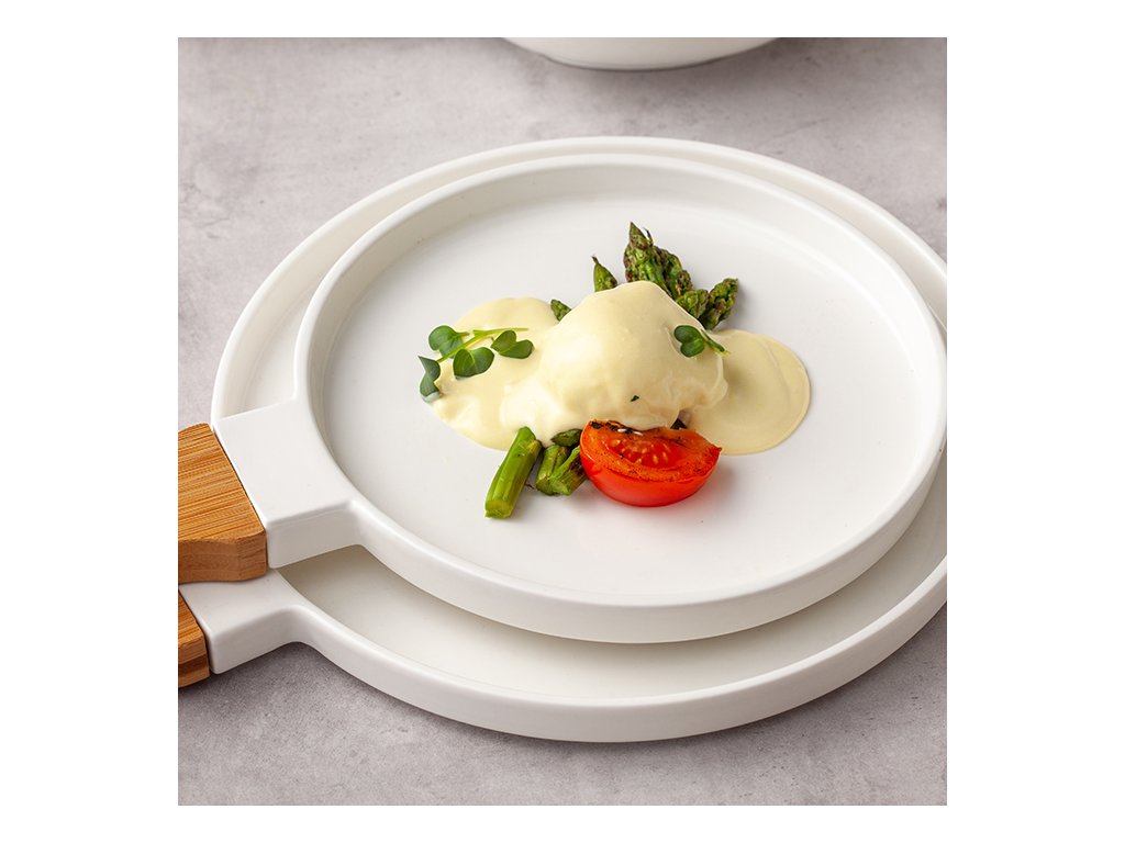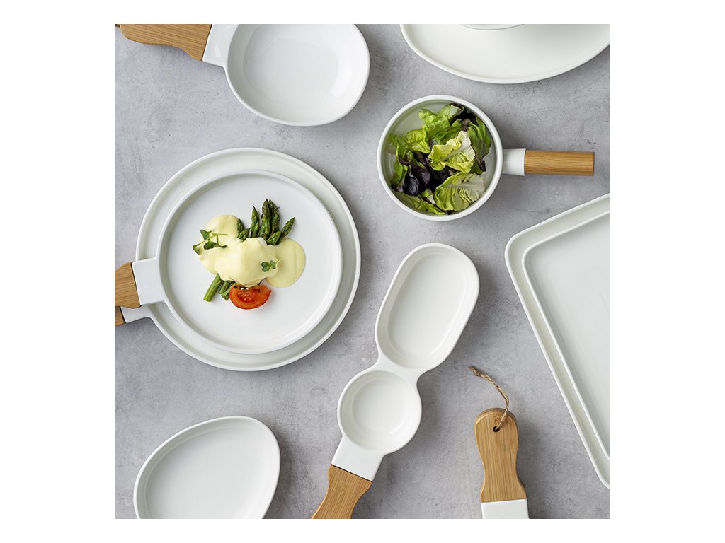 Talíř má elegantní, jednoduché linie. Je ideální pro ty, kteří hledají na svém stole moderní, ale zároveň nadčasovou estetiku. Je vyroben z vysoce kvalitního porcelánu, s bambusovou rukojetí a vyhovuje předpisům pro styk s potravinami .