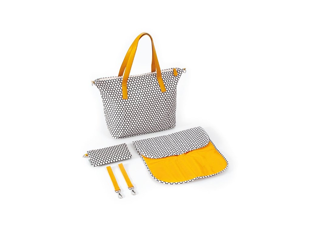 Přebalovací taška ke kočárku. Tato krásná trendy taška je vybavena přebalovací podložkou a samostatnou taštičkou. Tašku lze využit nejen na kočárek ale i jako klasickou kabelku. Taška je vybavena postranními popruhy, které umožňují připevnění ke kočárku. Zadní kapsa na magnet. Taška ke kočárku přizpůsobená dětským potřebám: - 1x vnější kapsa na magnet, - 3x vnitřní kapsa na gumičku, - 1x vnitřní kapsa na zip, - 1x termo vnitřní kapsa n gumičku, - 1x popruh na klíče, - vložené pevné dno, - 1x samostatná taštička, - 1x přebalovací podložka. Tašky jsou uvnitř i vně nepromokavé a tím jednoduše omyvatelné vlhkou tkaninou. Vhodná na procházky nebo k cestování s dítětem. Rozměry tašky : - šířka: cca 44 cm, - výška: cca 34 cm, - hloubka: cca 17 cm. 1. Jakost.Doplňkové parametry